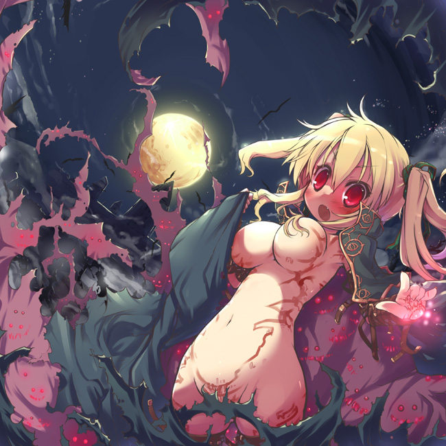 1girlblonde hairbreastsfangfemale focuslong hairlooking at viewermedium breastsmoonred eyessolotorn clothestwintails