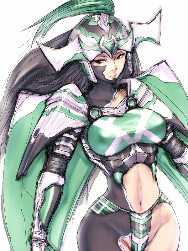 1girlarmorasymmetrical clothesblack eyesblack hairbreastscurvyfemale focusgreen hairhelmethip focuslarge breastslong hairlooking at viewermidriffpauldronssamuraishoulder armorsolowhite backgroundwide hips