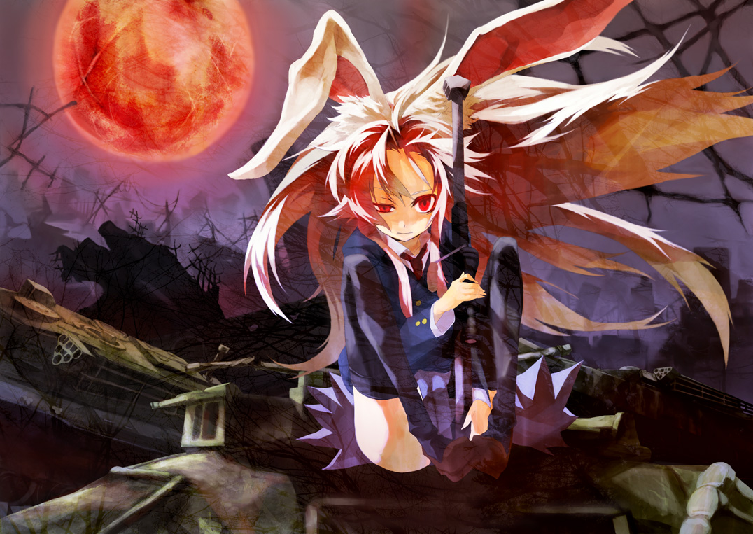 1girlanimal earsassfemale focusfull bodygunlong hairmoonoutdoorspurple hairrabbit earsred eyesred moonsittingskysoloweapon