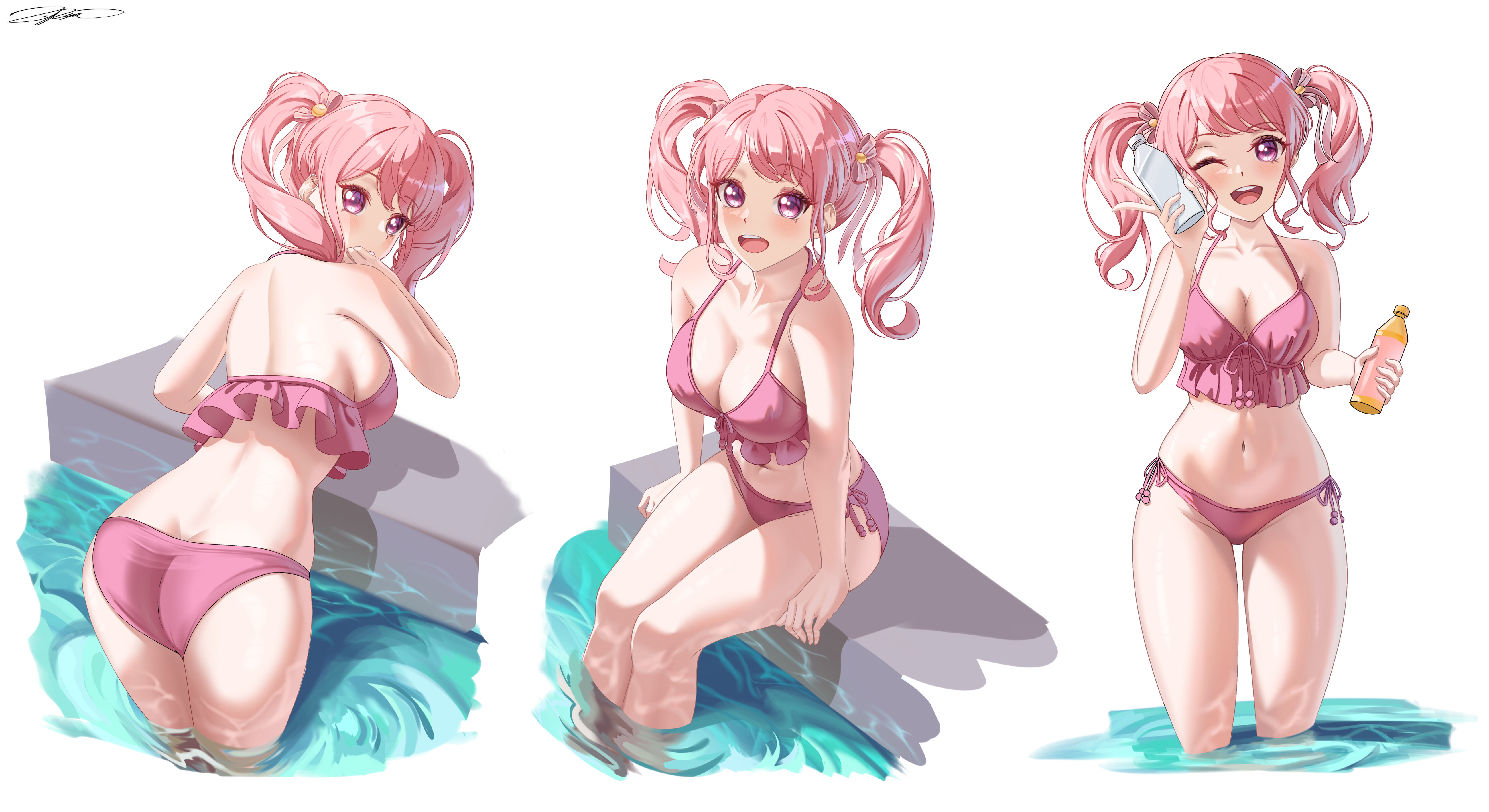 1girlalternate costumebare shouldersbikinibottlebreastscleavagefrilled bikinifrillsholdingholding bottlelooking at viewermedium breastsmedium hairmultiple personanavelopen mouthpink bikinipink hairpoolpoolsidesideboobsignaturesimple backgroundsittingsolostandingstanding on liquidswimsuitteeththighstwintailsupper bodyupper teeth onlyvwhite background