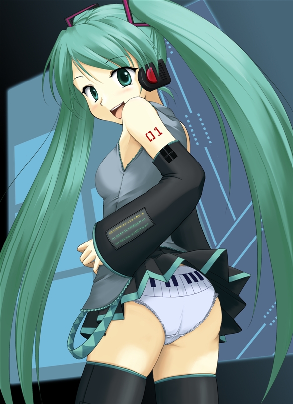 1girlassbare shouldersdetached sleevesfemale focusfrom behindgreen eyesgreen hairlong hairlooking at viewerlooking backmatching hair/eyesopen mouthpantiespantyshotpiano printskirtsmilesolothighhighstwintailsunderwearupskirt