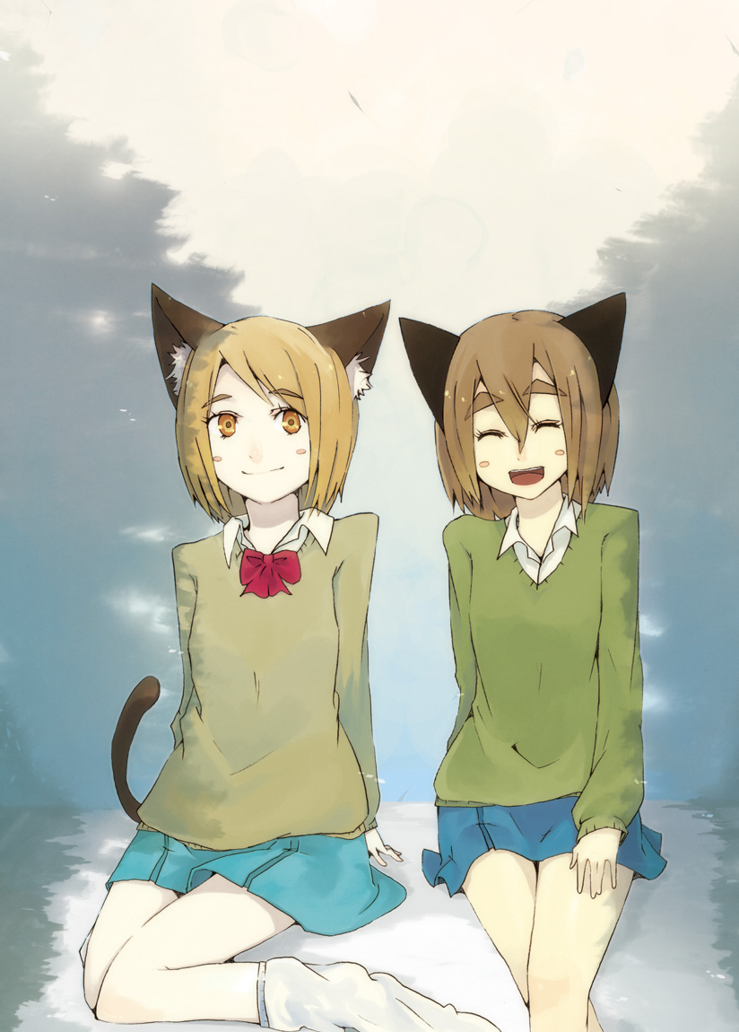 animal earsblushbrown eyesbrown hairhappyloose socksschool uniformshort hairsittingskirtsmilesockstail