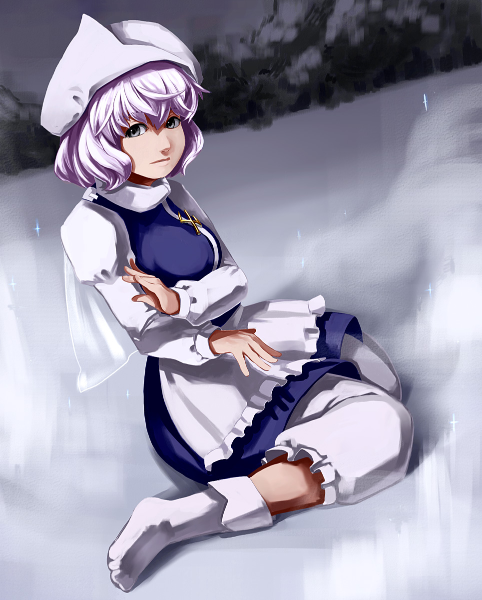 tsa, sajo yukimi, idolmaster, idolmaster cinderella girls, absurdres, highres, 1girl, black pantyhose, blue hair, blue hairband, blue skirt, blunt bangs, bow, crossed ankles, feet, feet up, full body, grey background, hairband, hime cut, juliet sleeves, long hair, long sleeves, looking at viewer, lying, no shoes, on stomach, open mouth, pantyhose, puffy sleeves, purple bow, red eyes, shadow, shirt, sidelocks, simple background, skirt, solo, the pose, very long hair, white bow, white shirt