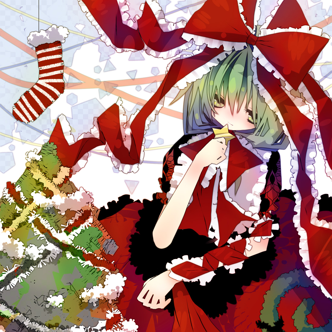 1girlchristmasfemale focusfront ponytailgreen eyesgreen hairmatching hair/eyesribbonshort hairsolostar (symbol)