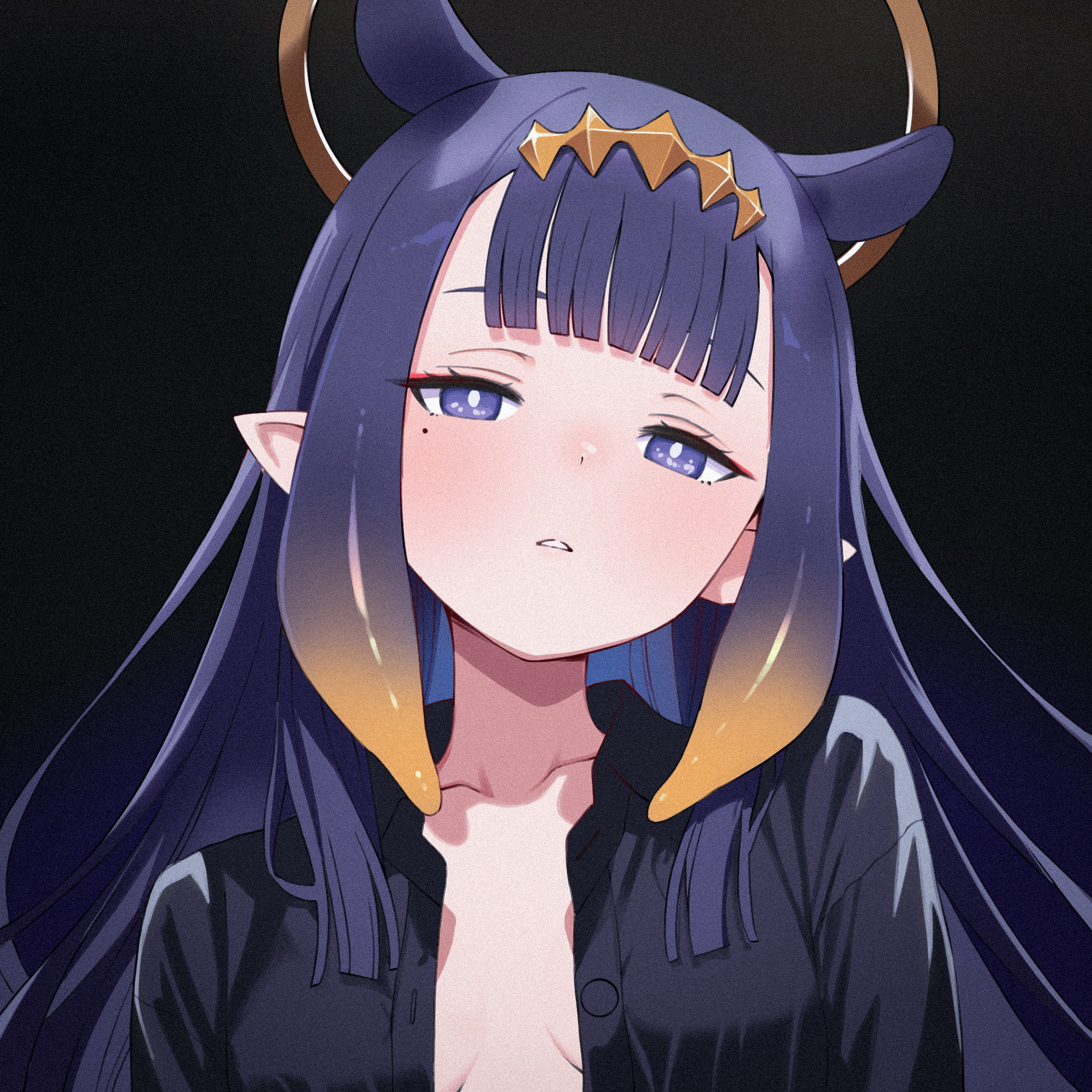 1girlblack backgroundblack shirtblunt bangsbreastscollarbonehaloheadpiecelong hairlooking at viewermolemole under eyeopen clothesopen shirtparted lipspointy earspurple eyespurple hairshirtsimple backgroundsmall breastssolotentacle hairupper bodyvirtual youtuber