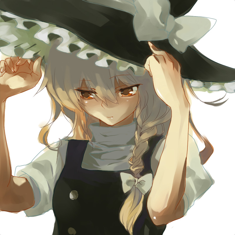 1girlblonde hairbowbraidfemale focusfingernailshair bowhand on headwearhatlong hairorange eyesribbonsadside braidsimple backgroundsoloturtleneckupper bodywitchwitch hat