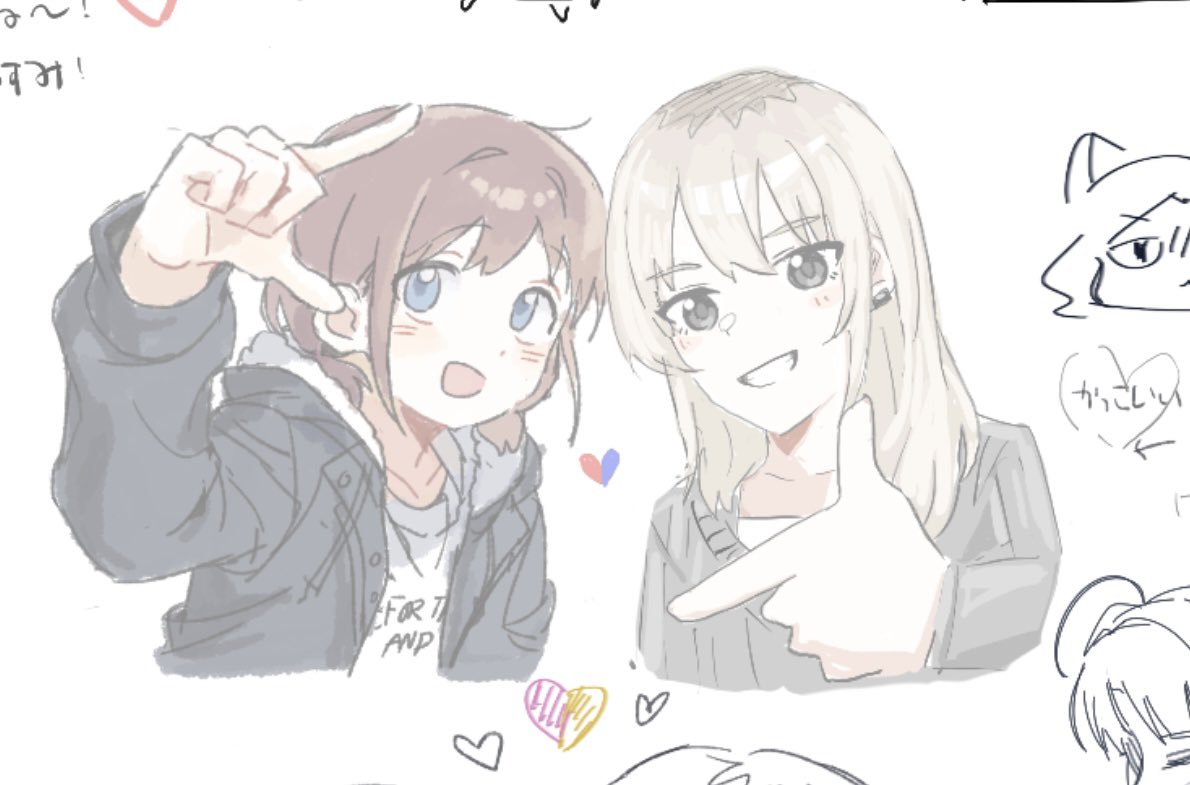 2girlsblack sweaterblue eyesbrown hairclenched teethgrey eyesgrey hairheartlong hairlong sleeveslow twintailsmulticolored hairmultiple girlsopen mouthroots (hair)shirtshort hairshort twintailssimple backgroundsweaterteethtwintailsupper bodywhite backgroundwhite shirt