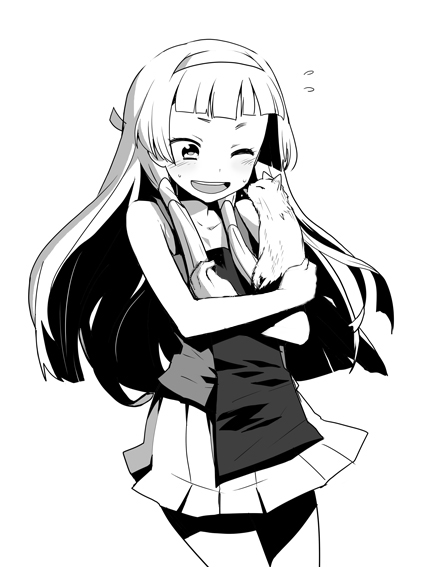 shiwasu no okina, highres, crossed legs, greyscale, grin, legs, monochrome, pleated skirt, school uniform, serafuku, sitting, skirt, smile, socks, solo, sweater, sweater vest, thighs, vest
