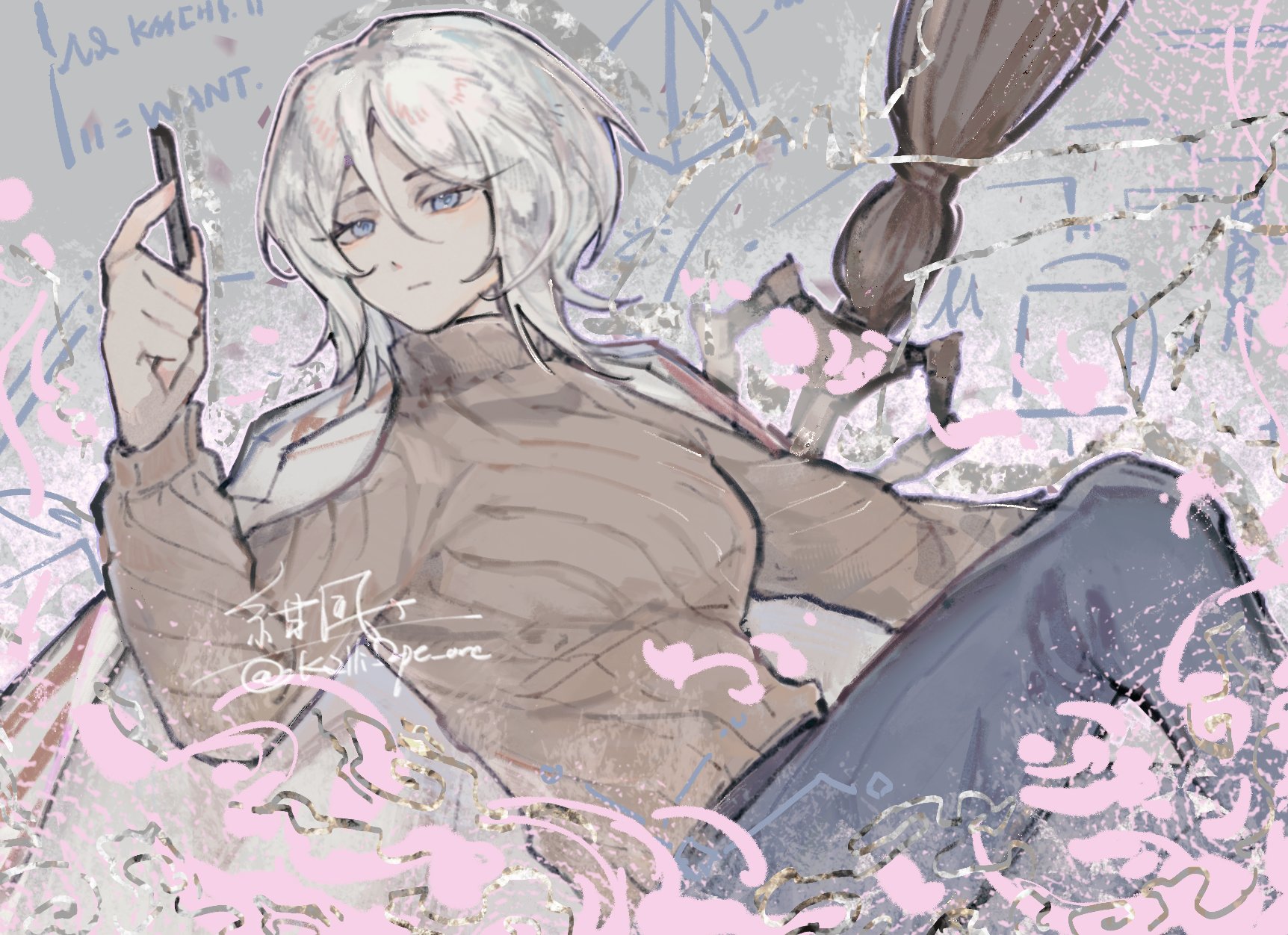 1girlblue eyesbreastsbroomdenimexpressionlessfeet out of frameholdingjeanslyingmedium breastsmedium hairon backpantssignaturesolosweatertwitter usernamewhite hair