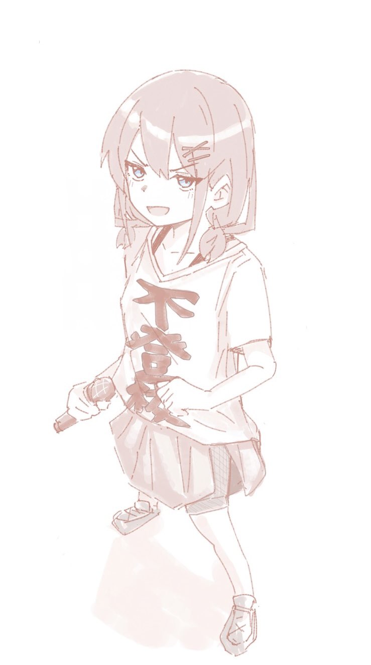 1girlblue eyeshair ornamenthairclipholdingholding microphonelow twintailsmicrophonemonochromepleated skirtshikai no sumi kuchiru otoshoesshort hairshort sleevesshort twintailssimple backgroundskirtsolospot colorstandingtwintailswhite background
