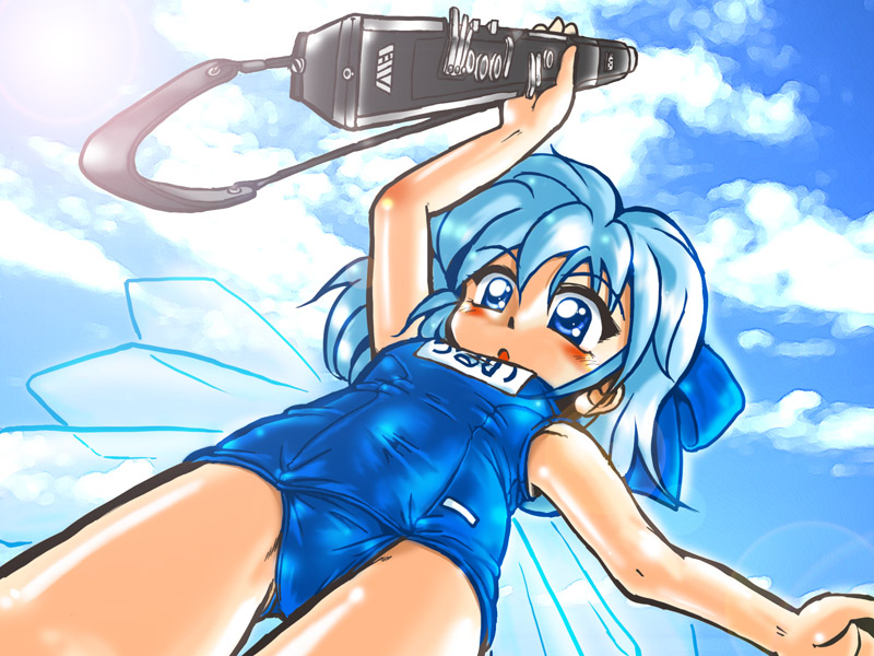 1girlblue eyesblue hairelectric wind instrumentfemale focusfrom belowinstrumentmatching hair/eyesname tagone-piece swimsuitschool swimsuitsoloswimsuit