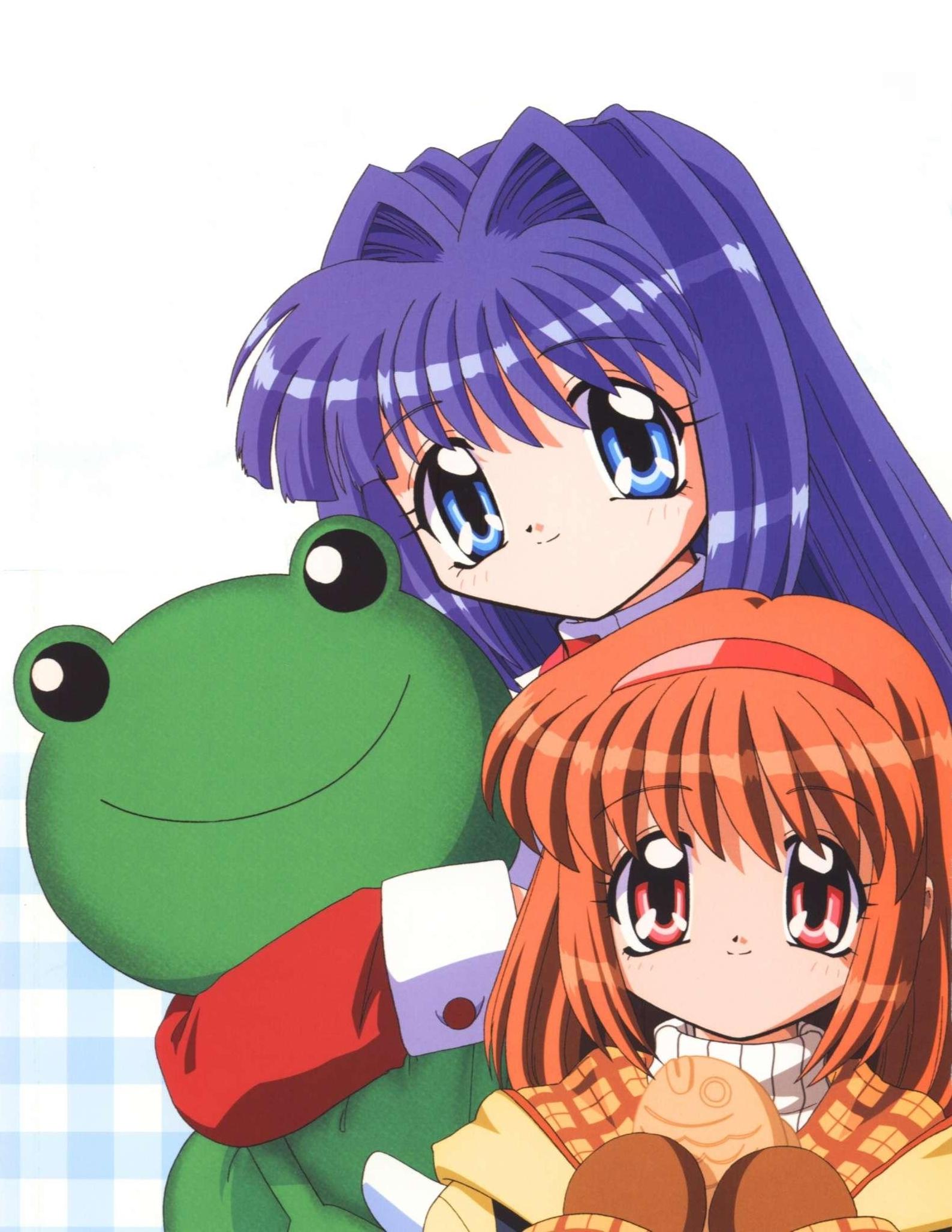 2girlsblue eyesblue hairfoodhairbandlong hairmittensmultiple girlsorange hairred eyesshort hairsmilestuffed animalstuffed frogstuffed toytaiyakiwagashi