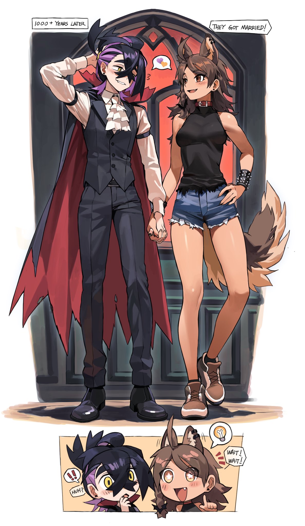 nana nana bot, don quixote (project moon), limbus company, project moon, highres, + +, 1boy, 1girl, :d, black gloves, black jacket, black pants, blonde hair, blue cape, blue hat, blue necktie, blue sky, cape, cavalier hat, cinq association south uniform, cloud, collared shirt, fang, gloves, hat, hat feather, jacket, la manchaland's don quixote (project moon), long hair, looking at another, musketeer, necktie, one eye closed, open mouth, outdoors, pants, plume, red eyes, shirt, short hair, simple background, skin fang, sky, smile, sparkling eyes, standing, upper body, white hair, white shirt, yellow eyes