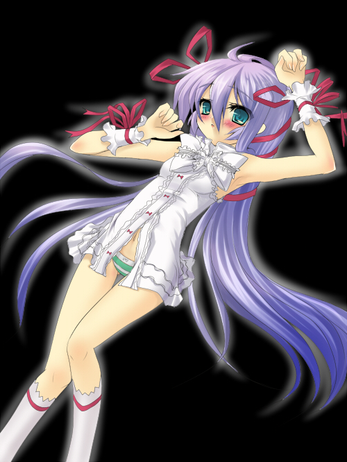 00sblushfrillsgreen eyeshair ribbonlong hairpantiespurple hairribbonstriped clothesstriped pantiesunderwearwrist cuffs