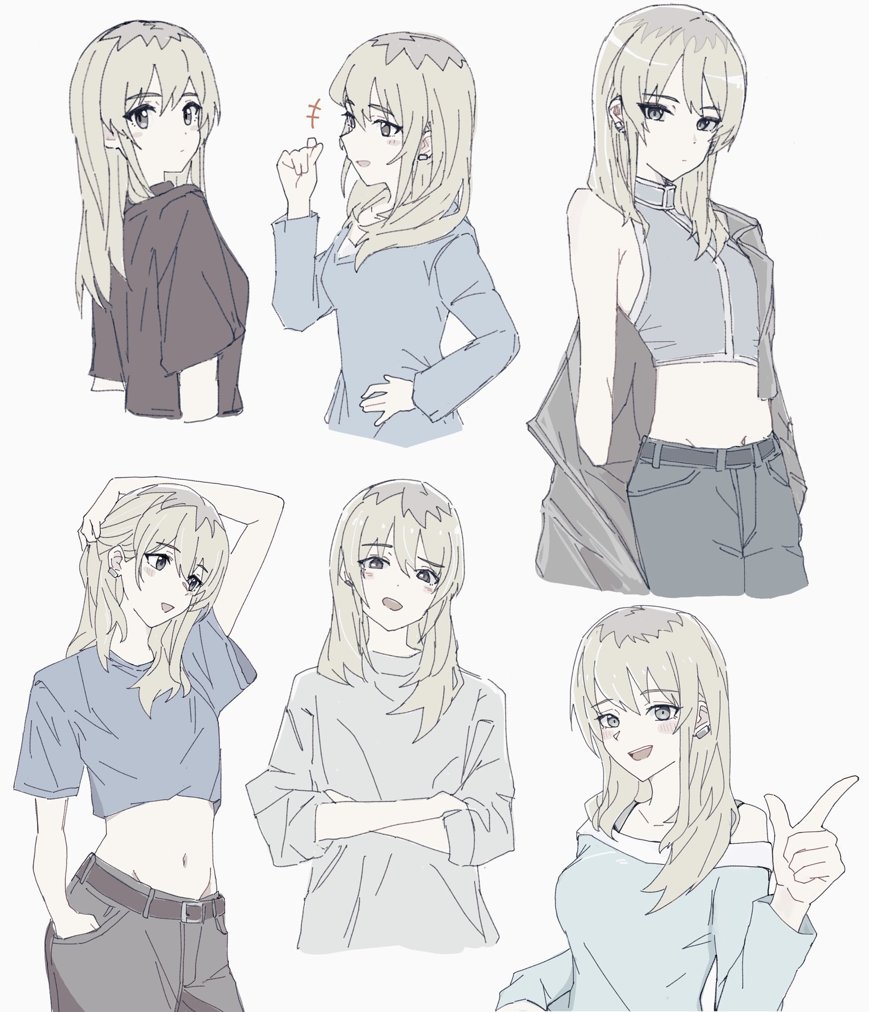 1girlbeltblack beltblack pantsblack shirtblue shirtbreastscrop topcrossed armsearclipgrey eyesgrey hairhand on own hiphand uplong hairlong sleevesmedium breastsmidriffmulticolored hairmultiple viewsnavelpantsroots (hair)shirtshort sleevessimple backgroundsleevelesssleeveless shirtsmall breastswhite background