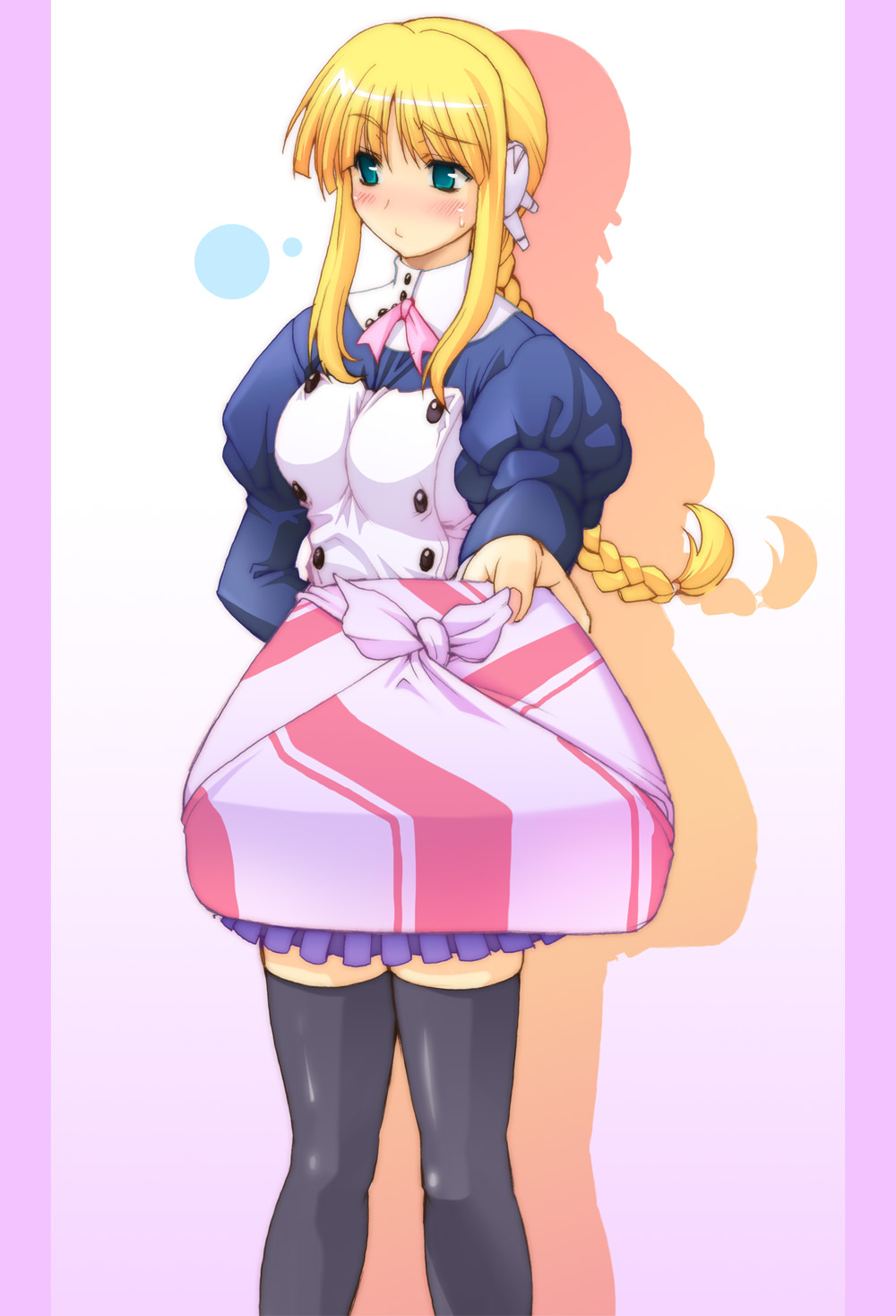 00s1girlblonde hairblushbraidfemale focusgiftgreen eyesholdingholding giftsolothighhighszettai ryouiki