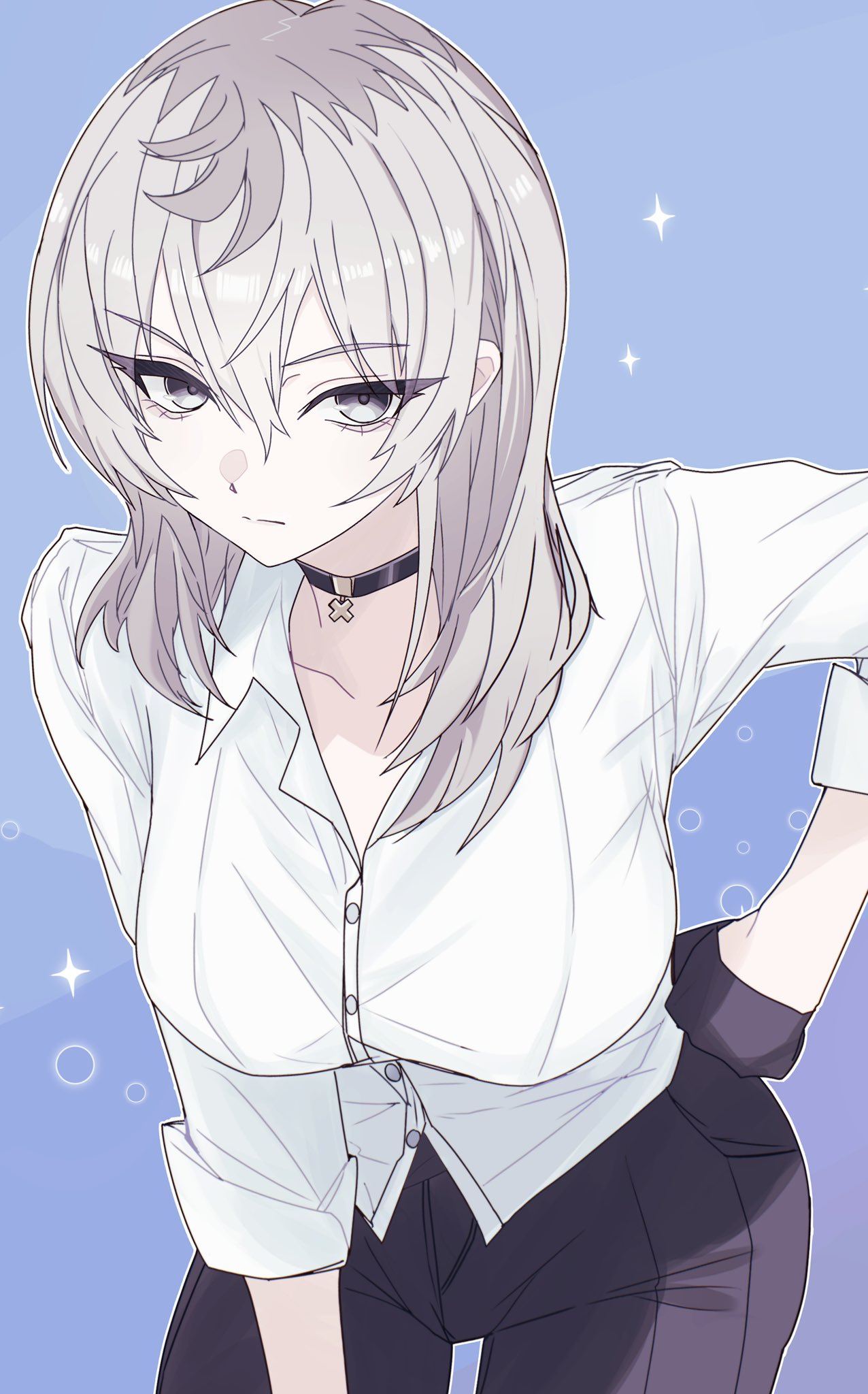 1girlblack chokerblack glovesblack pantsblue backgroundblushbreastschokerclosed mouthcowboy shotdress shirtglovesgrey eyesgrey hairhair between eyeshand on own hipleaning forwardlong hairlooking at viewermedium breastsmulticolored hairoutlinepantsroots (hair)shirtsimple backgroundsolosweatwhite outlinewhite shirt