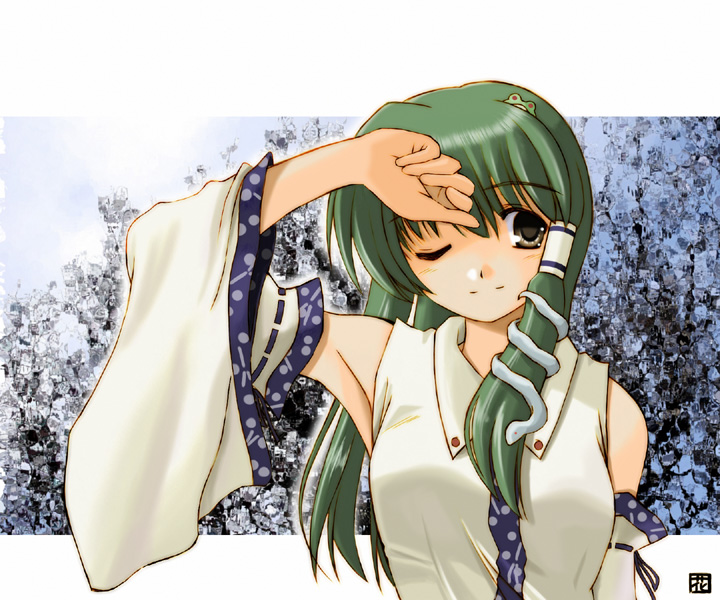 :d1girlarm uparmpitsbrown eyesdetached sleevesfemale focusgreen hairhair ornamentlooking at viewernontraditional mikoopen mouthparted lipssmilesnake hair ornamentsoloupper bodyvestwink