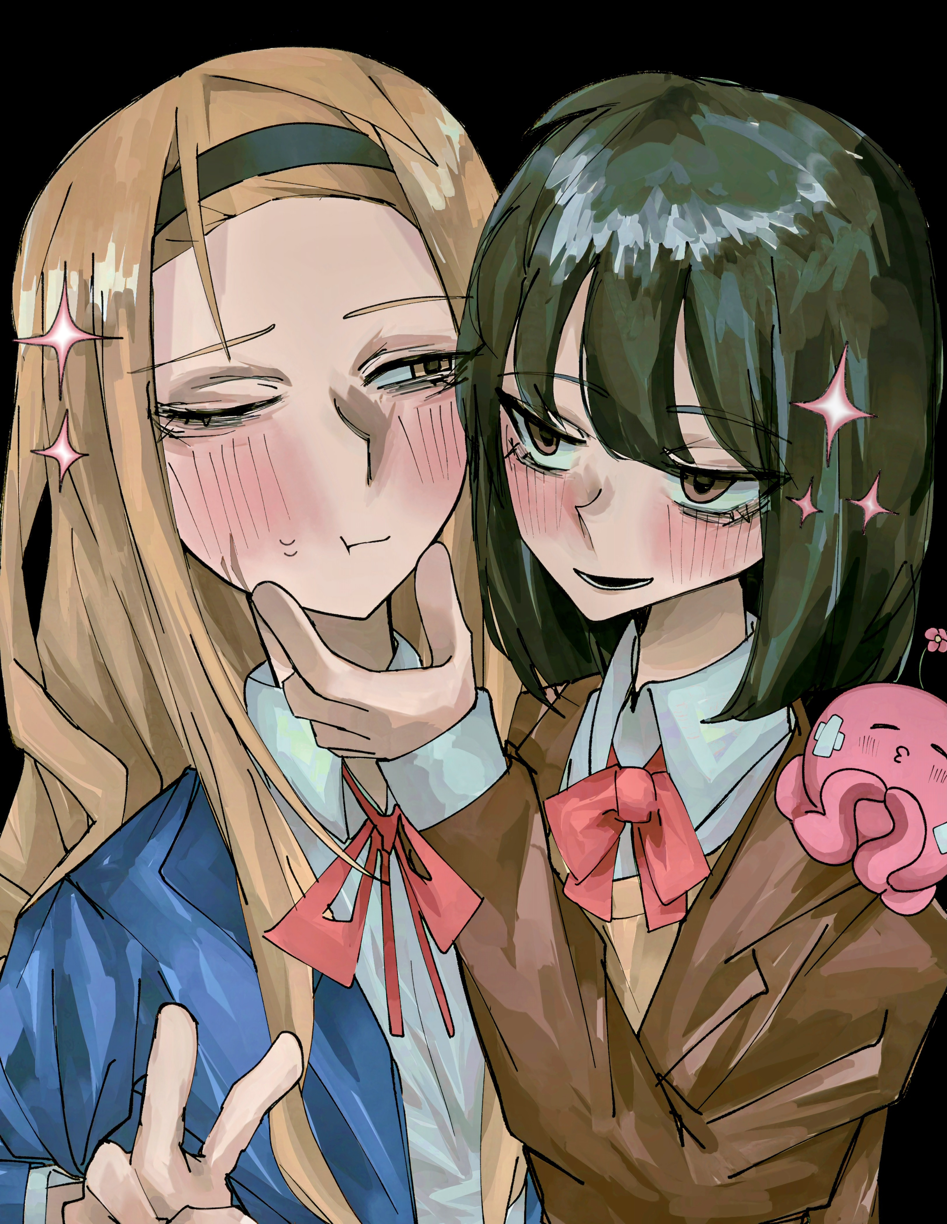 shiratos nas, rena (blue archive), blue archive, absurdres, highres, 1girl, ?, black bow, black ribbon, black skirt, blonde hair, blush, bow, brown eyes, brown hair, cardigan, collared shirt, hair between eyes, hair bow, hair ornament, hair ribbon, hairclip, long sleeves, lying, multicolored hair, neck ribbon, on back, parted lips, pillow, ribbon, shirt, skirt, solo, speech bubble, streaked hair, thought bubble, twintails, white shirt, x hair ornament, yellow cardigan