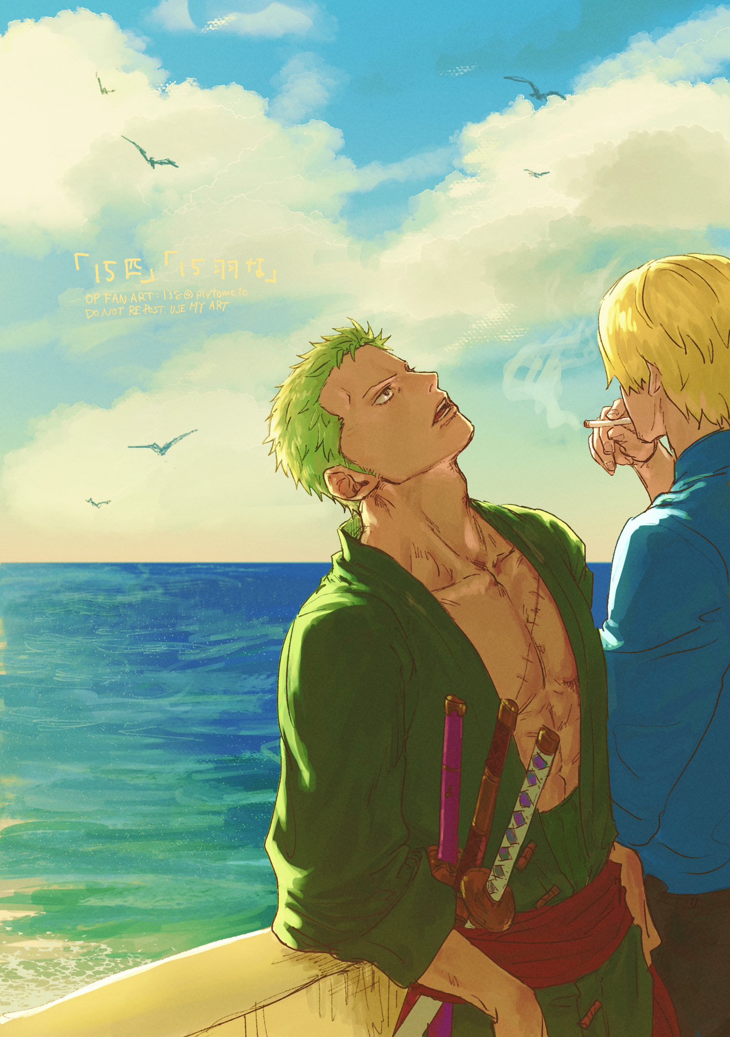 2boysabsadam's applebirdblonde hairblue shirtblue skycigarettecloudcollarbonedaygreen hairholdingholding cigarettejapanese clotheskimonolooking upmale focusmultiple boysoceanopen mouthoutdoorspectoralsred kimonoseagullshirtshort hairskysmokingstitched chestswordweapon