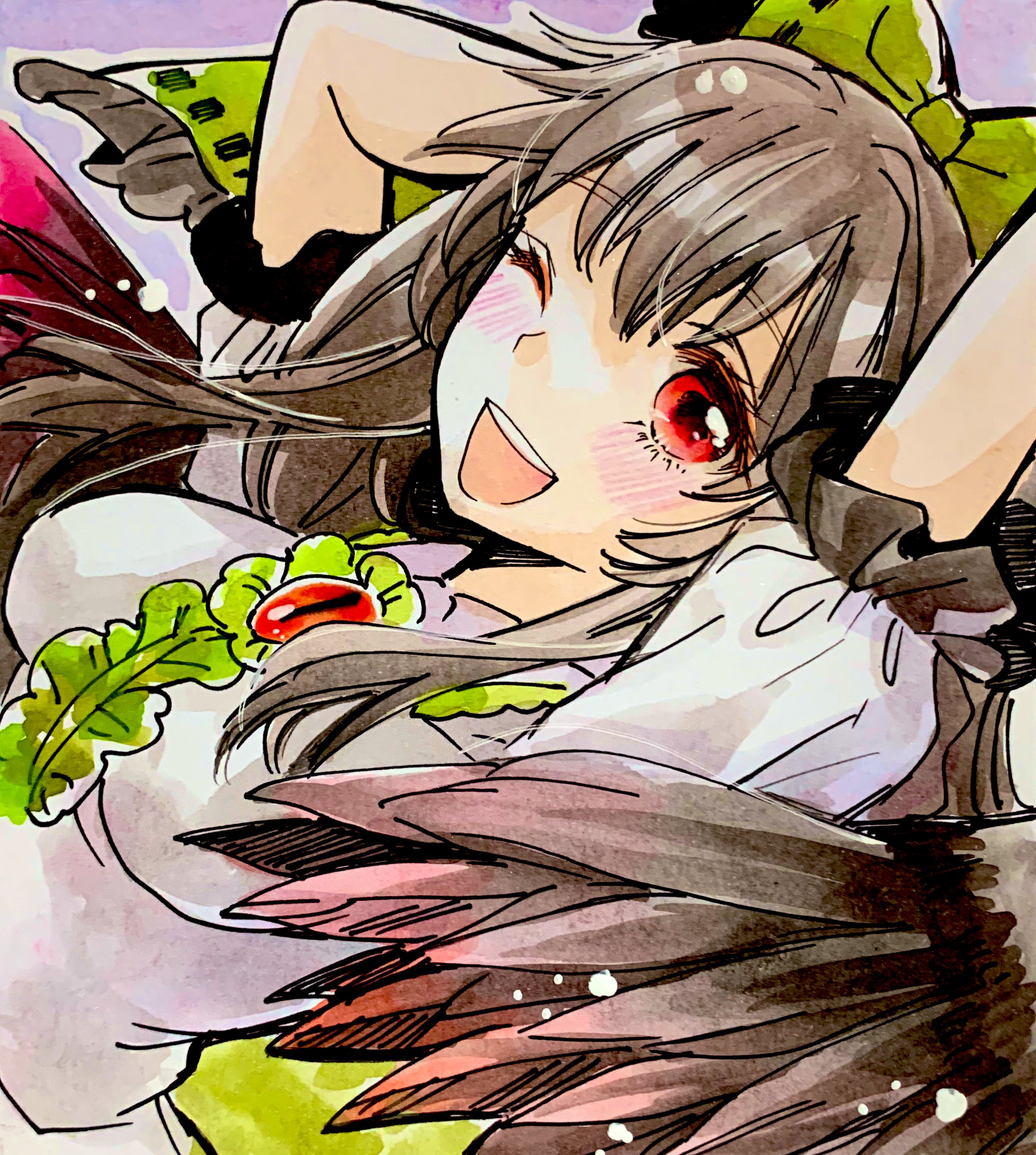 1girlblack haircropped torsofeathered wingsgreen ribbonhair ribbonlong hairlooking at viewerribbonshirtshort sleevessoloupper bodywhite shirtwings