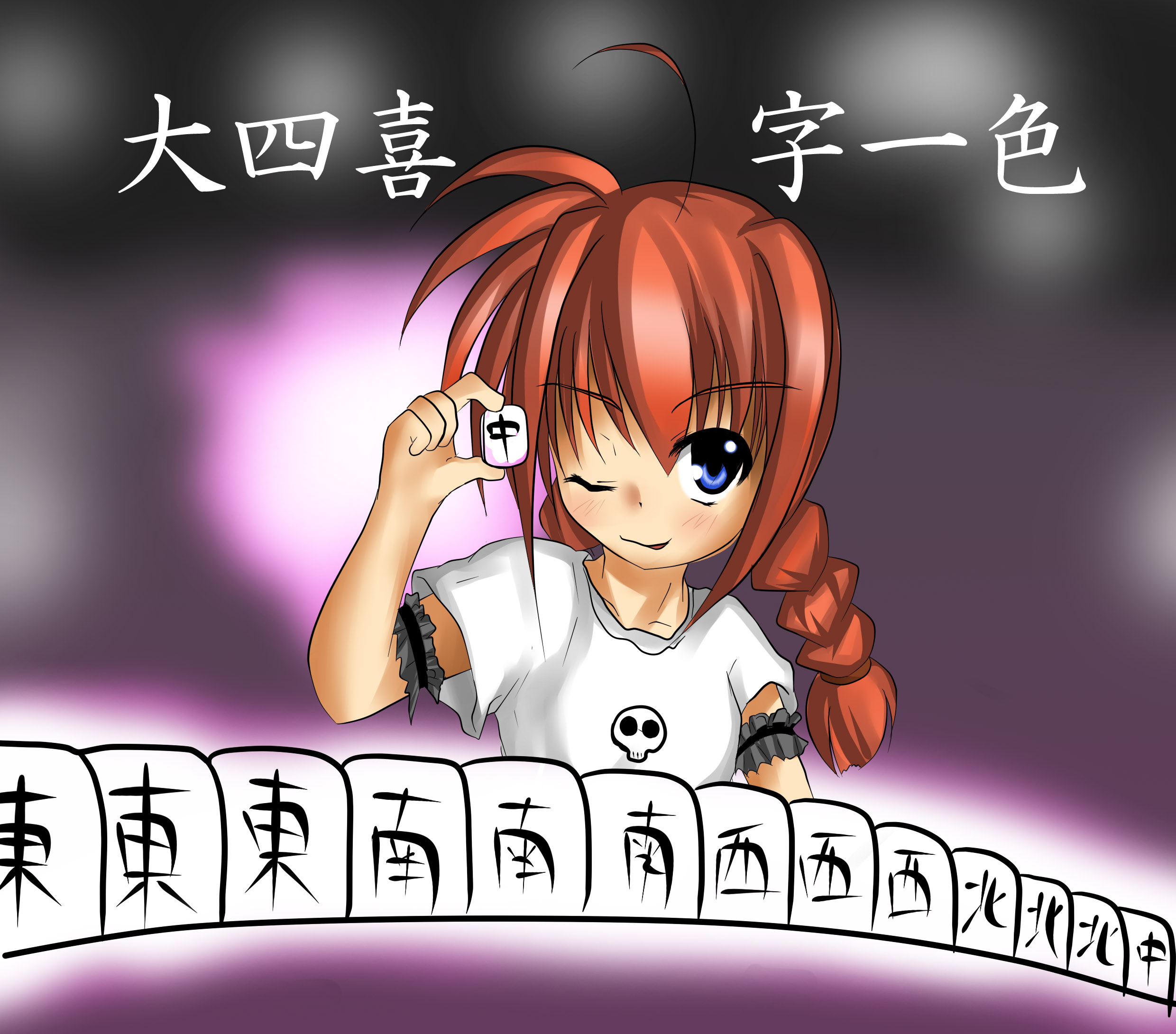 00s1girlahogeblue eyesboard gamebraidfemale focusholdingholding mahjong tilemahjongmahjong tileone eye closedred hairshirtsolot-shirtwink