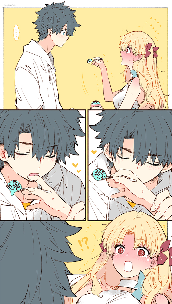 1boy1girlblack hairblonde hairclosed eyesfoodheteroholdingholding spoonice creamlong hairlooking at anotherone-piece swimsuitopen mouthred eyesshort hairspoken ellipsisspoonswimsuittremblingyellow background