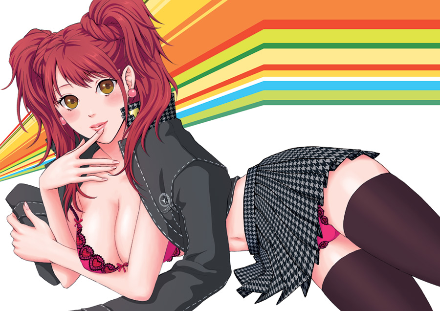 1girlblushbowbow brabrabreastsbrown eyescleavageearringsfemale focushearthoundstoothjewelrylacelingerielipsticklyingmakeupminiskirton sidepantiespink brapink pantiespleated skirtred hairschool uniformskirtsolothighhighstwintailsunderwear