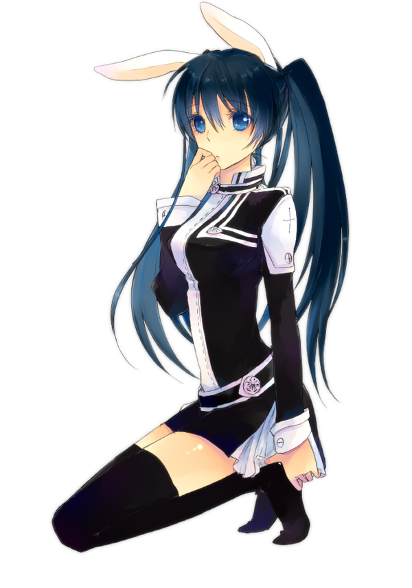 1girlanimal earsbeltblack bootsblack jacketblack order uniformblack skirtblue eyesblue hairbootscollared jacketfrilled skirtfrillshair between eyeshand on own chinjacketlegslong hairlong sleeveslooking at viewerminiskirtparted bangsrabbit earssidelockssimple backgroundskirtsolosquattingstriped clothesstriped jacketstriped skirtthigh bootsthighhighsthighstiptoestwintailsvertical-striped clothesvertical-striped jacketvertical-striped skirtvery long hairwhite backgroundzettai ryouiki