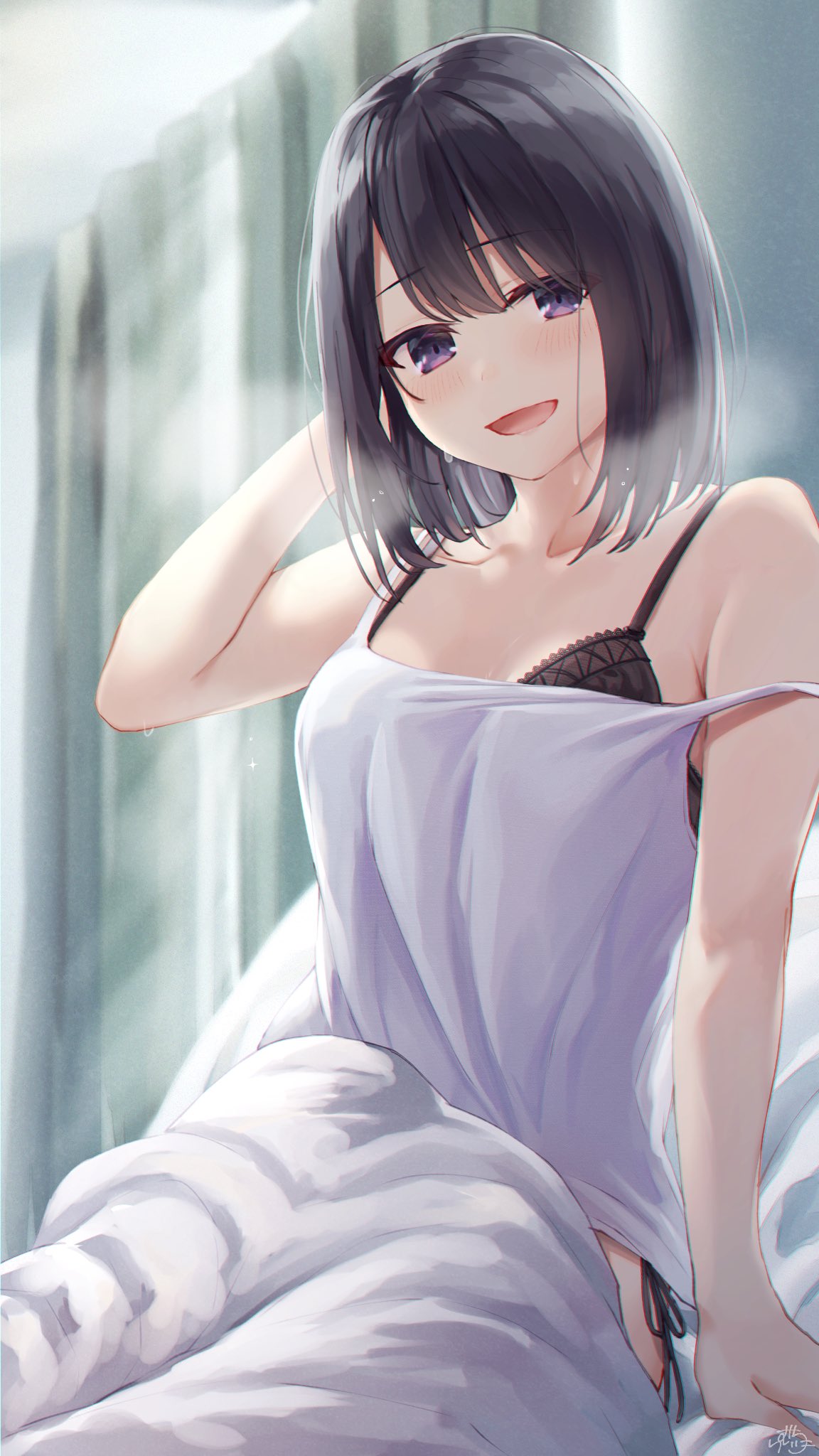 1girlarm uparmpit creaseblack hairblanketbrabreastshand in own hairlacelace bralight blushlooking at viewermedium hairopen mouthpanty strapspurple eyesquiltsolosteamsweatunderwear