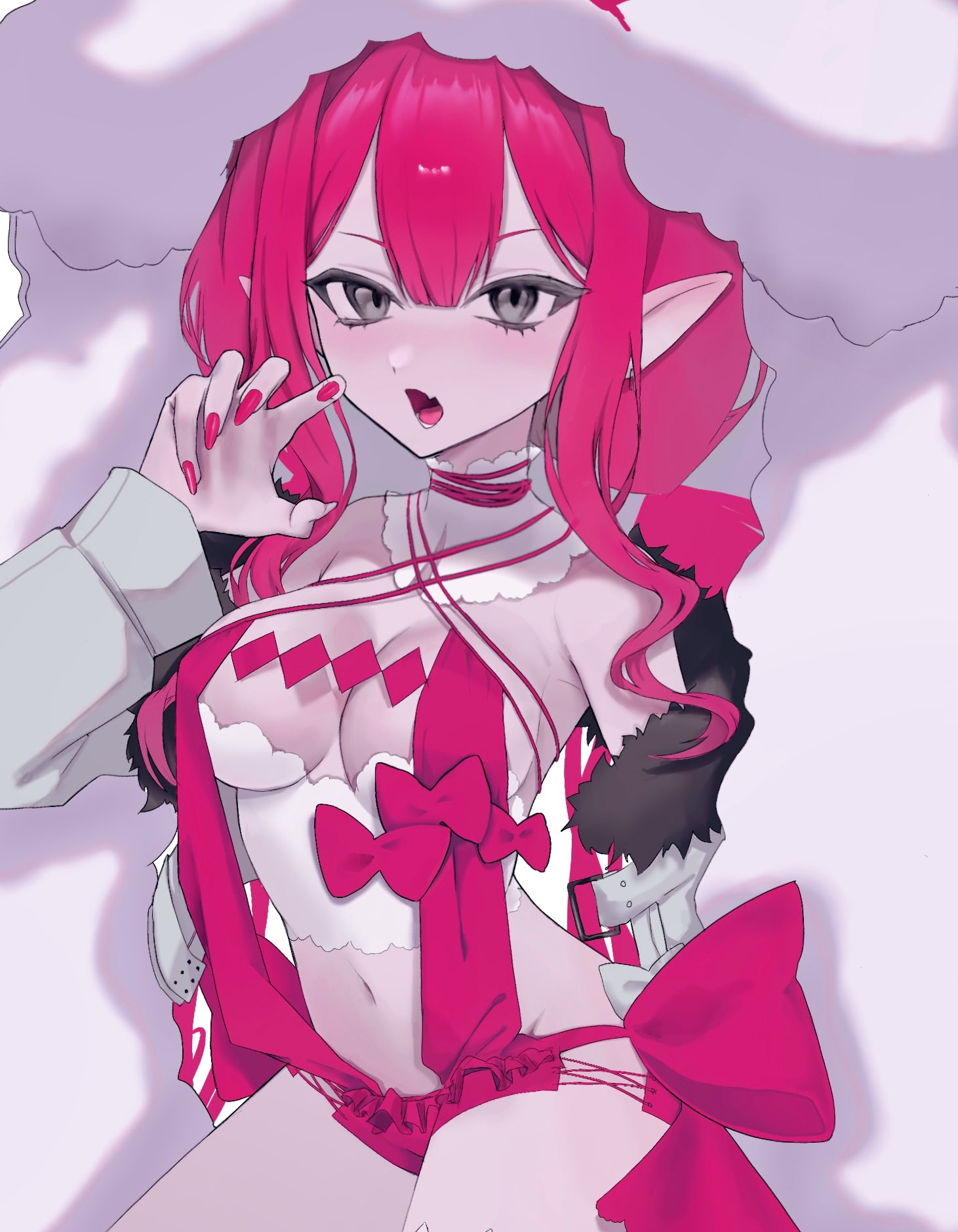 1girlblushbreastscamisolecleavagedetached collarfangfur trimfur-trimmed jacketgrey eyesjacketlong hairlooking at viewermedium breastsmicro shortsnavelopen mouthpink hairpink nailspointy earsrami (zwndu0)shortssidelocksskin fangsolo