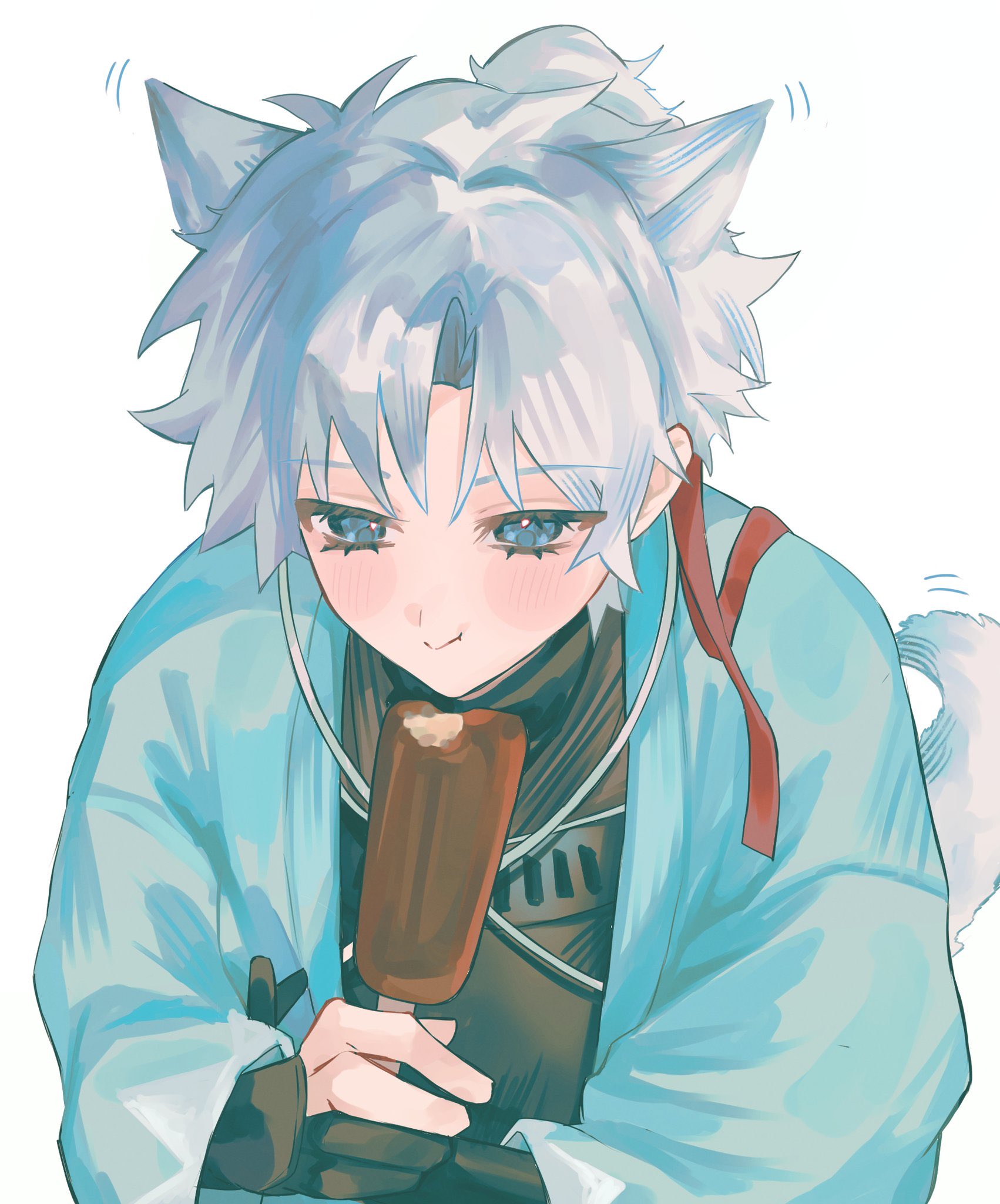 :i1boyanimal earsblack kimonoblue eyesblue haoriblushdog boydog earsdog taileatingfoodhaoriholdingholding foodholding ice creamice creamjapanese clotheskemonomimi modekimonomale focusponytailshinsengumisolotailtoudou heisuke (fate)upper bodywhite hair