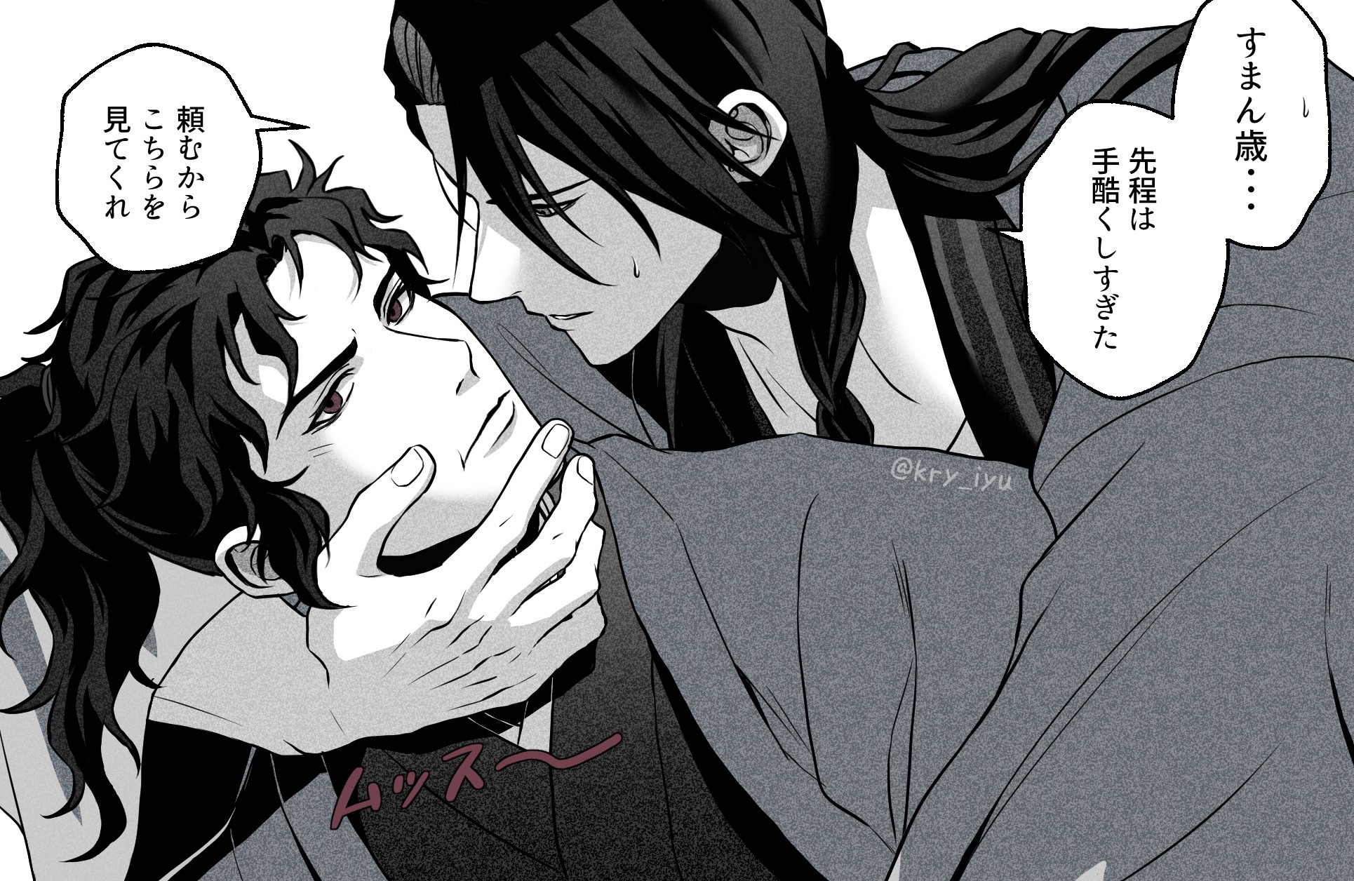 2boysbraidhaorijapanese clotheskimonolong hairmale focusmultiple boysponytailred eyessimple backgroundspeech bubblespot colorsweatdropupper bodywhite backgroundyaoi