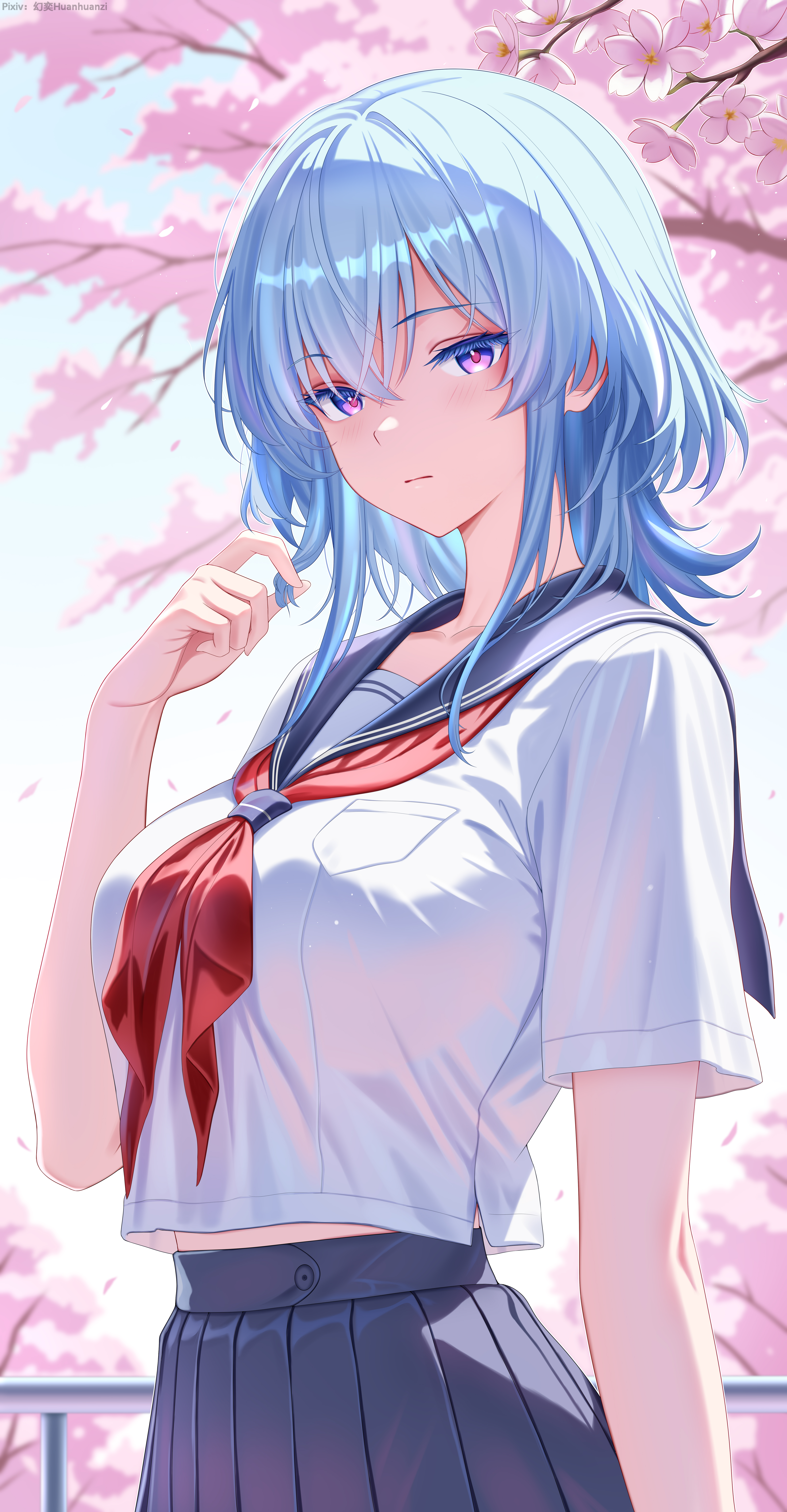1girlalternate costumeartist nameblue hairbreastscherry blossomsclosed mouthcolored eyelashescowboy shotgrey sailor collargrey skirthand uplarge breastslight blushlong hairlooking at viewermidriff peekneckerchiefoutdoorspurple eyesred neckerchiefred pupilssailor collarschool uniformserafukushirtskirtsolotwirling hairwhite shirt