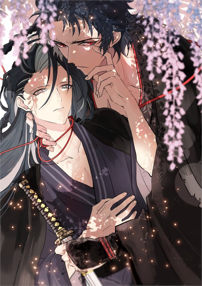 2boysblack haircurtained hairflowerglovesgrey eyesheterochromiaholdingholding swordholding weaponjapanese clotheskatanakimonolong hairlooking at viewermale focusmultiple boysnoni (3dal2socks)pink flowerred eyesshort hairstringstring of fateswordweaponwisteriayaoi
