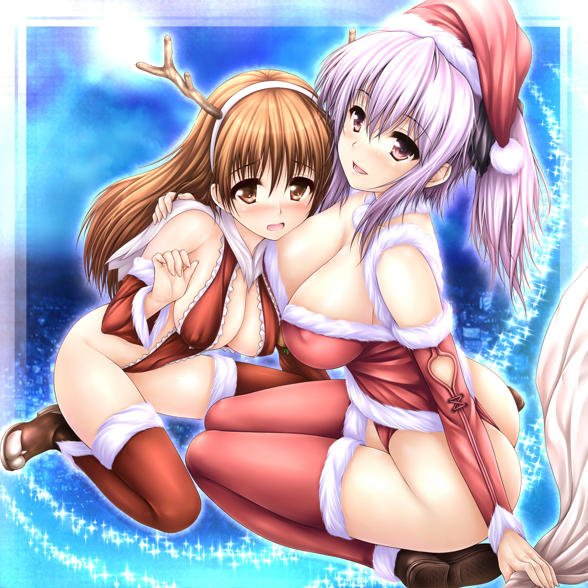 2girlsbreastsbrown eyesbrown hairchristmascleavagedetached sleeveshatlong hairmultiple girlspurple hairred eyessanta costumesanta hatsittingthighhighstwintails