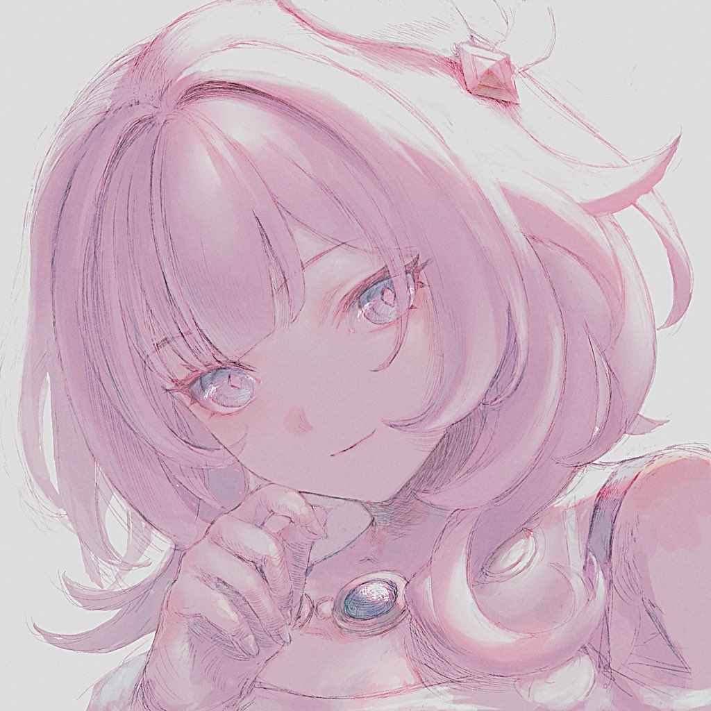 1girlblue eyesclosed mouthcyrene (aedes elysiae) (honkai: star rail)hair intakeshead tiltjewelrylight smilelooking at viewermedium hairnecklacepink hairpink pupilsportraitsidelockssolo