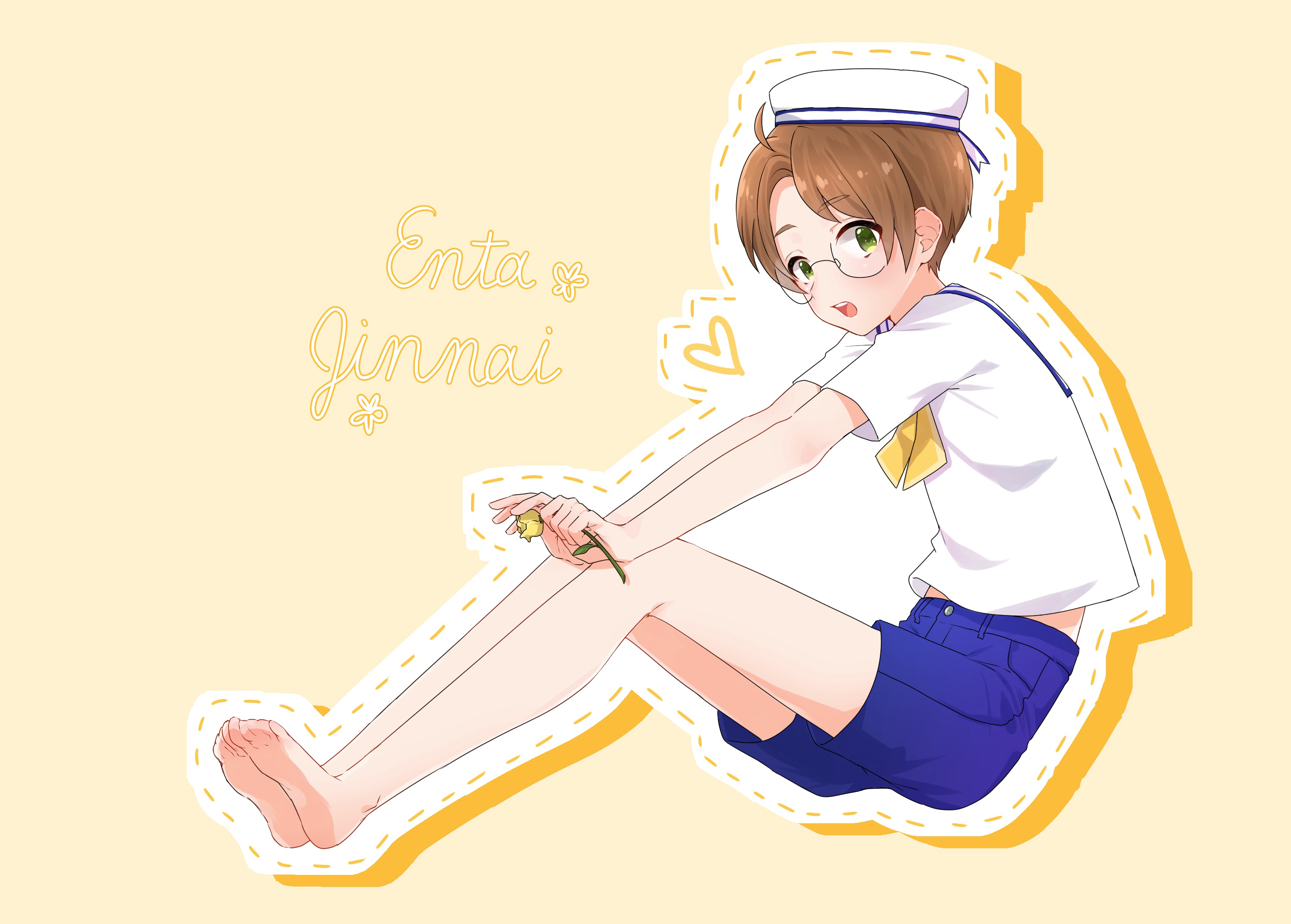 1boyahogebarefootblue shortsbrown haircharacter namedrop shadowflowerfull bodyglassesgreen eyeshatheartholdingholding flowerlooking at viewermale focusmidriff peekopen mouthoutlineribbonround eyewearshort hairshort sleevesshortssimple backgroundsolowhite hatwhite outlineyellow floweryellow ribbon