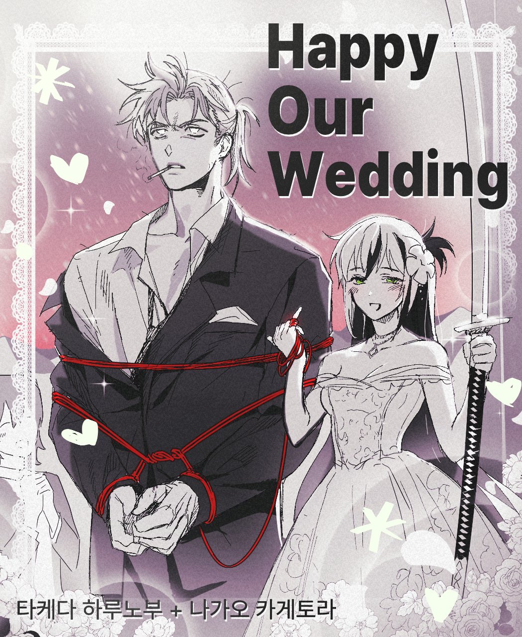 1boy1girlblushborderboundbound armsbound wristsbridecigarettedisheveleddressenglish textflowerformal clothesggamegvgreen eyesgrey eyesgroomhair flowerhair ornamentholdingholding swordholding weaponjacketjewelrykatanakorean textlong hairmememulticolored hairnecklaceopen mouthornate borderpinky outponytailrestrainedshirtsmilesmokingstringstring of fatesuitswordtied up (nonsexual)two-tone hairweaponweddingwedding dress