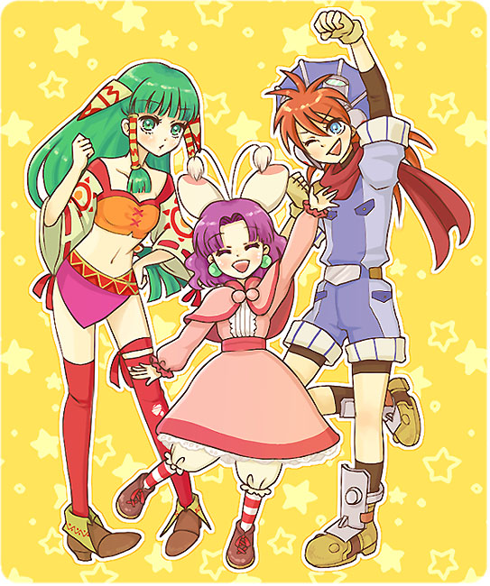 1boy2girlsbloomersblushclosed eyesdressearringsfriendsfull bodygreen eyesgreen hairhair tubesjewelrylayered sleeveslong hairmidriffmultiple girlsone eye closedpurple hairshoessmilestandingstanding on one legstar (symbol)star symbol backgroundthighhighsunderwearwhite bloomerswinkyellow backgroundzettai ryouiki