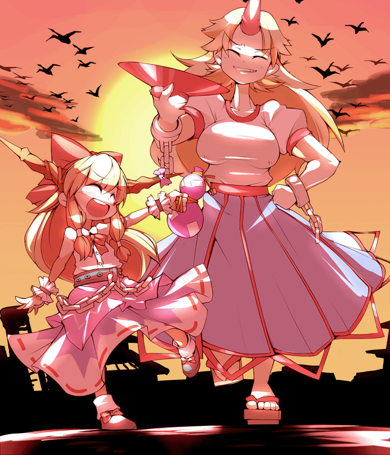 ukyo rst, hoshiguma yuugi, touhou, 1girl, blonde hair, cup, female focus, horns, long hair, red eyes, sakazuki, single horn, solo, wrist cuffs