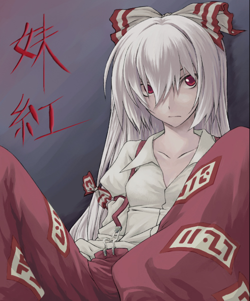 1girlcharacter namefemale focushair over one eyehair ribbonlong hairofudapantsred eyesribbonshirtsittingsolosuspenderswhite shirt