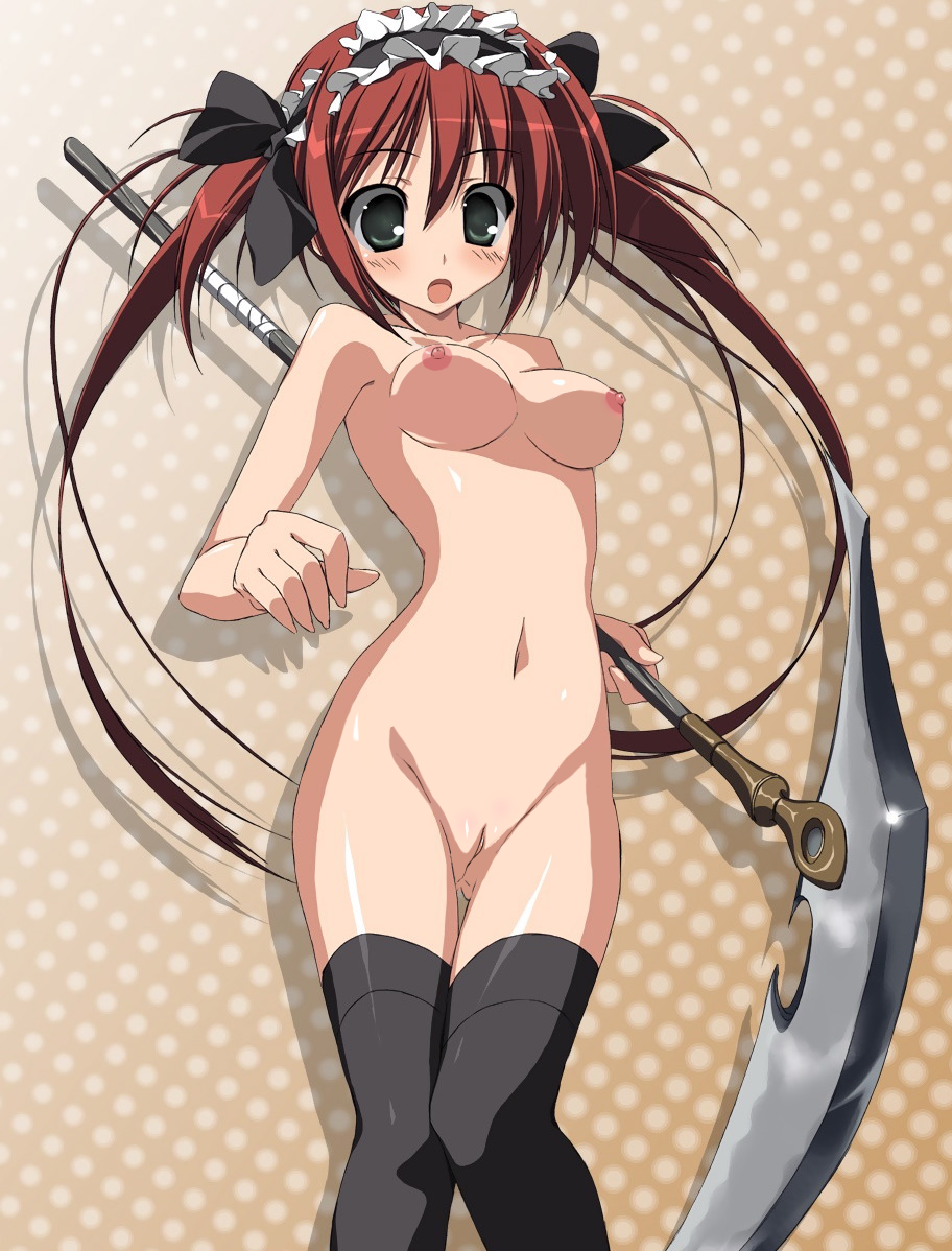 00s1girlblack thighhighsblushbreastsfemale focusgreen eyesgroinheaddresslong hairlooking at viewermaid headdressmedium breastsnavelnipplesnudeopen mouthpolka dotpolka dot backgroundpussyred hairribbonscythesilhouettesolostandingthigh gapthighhighsthighstwintailsuncensored