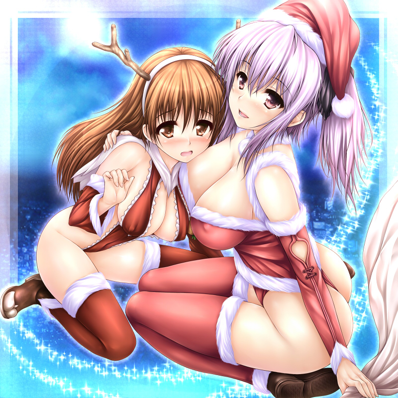 2girlsassblushbreastsbrown eyeschristmascleavagecovered erect nippleshatkneelinglarge breastslong hairmultiple girlspurple hairsanta costumesanta hatthighhighs