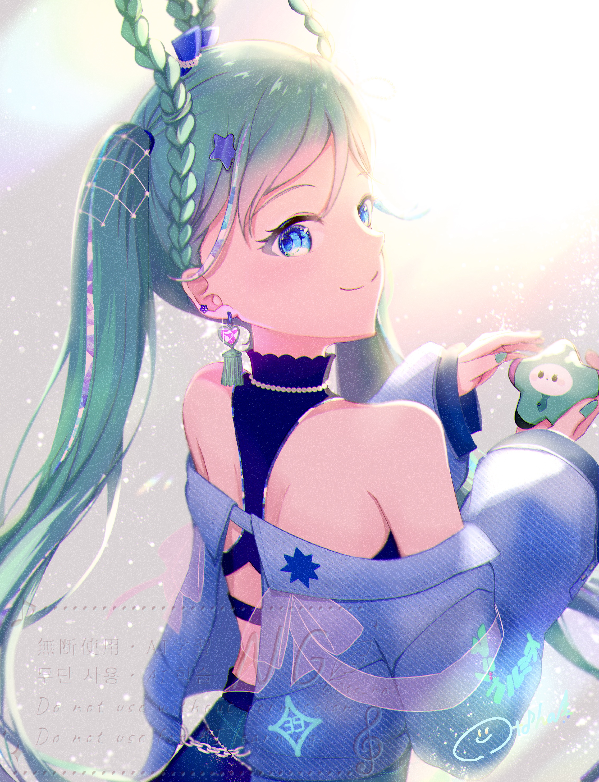 1girlaqua hairaqua nailsbare shouldersblue eyesblue jacketblushbraidbraided hair ringsclosed mouthcrop tophair between eyeshair ornamenthair ringsjacketlong hairlong sleeveslooking at viewerlooking backofficial alternate costumeofficial alternate hairstylepink nailssmilesolostar (symbol)star hair ornamenttwintailsvery long hair