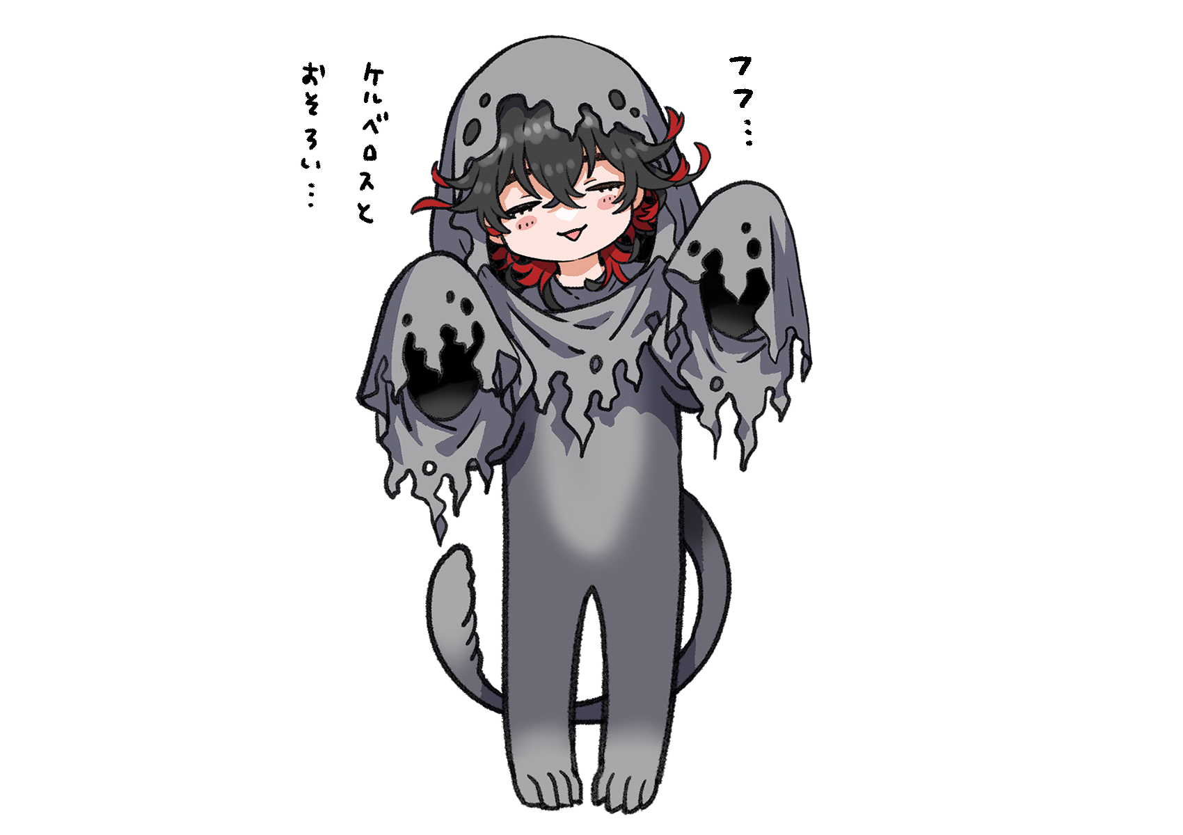 1boyanimal costumeblack hairblushcloakclosed eyescosplaydeformedfull bodygrey cloakhoodhood upkigurumimale focusmedium hairmulticolored hairopen mouthred hairsimple backgroundsleeves past fingerssleeves past wristssmilesolostandingtailtorn cloaktorn clothestwo-tone hairwhite background