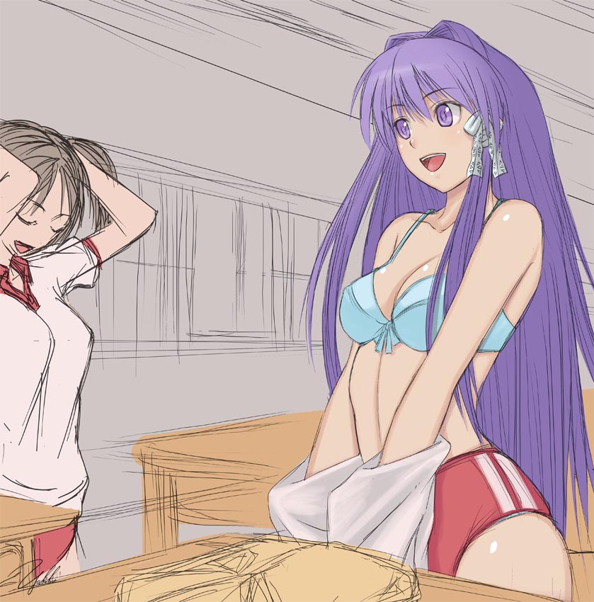 00s2girlsbrabreastsburumacleavagegym uniformlingerielong hairmultiple girlsopen mouthpurple eyespurple hairsignaturesketchunderwearundressingvery long hair