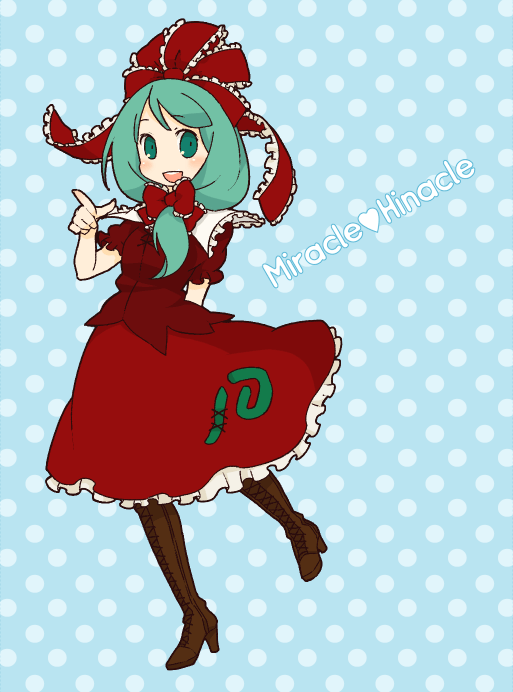 1girlbootsdressfemale focusfrillsfront ponytailfull bodygreen eyesgreen hairhappyhigh heelsmatching hair/eyesribbonshoessimple backgroundsolostanding