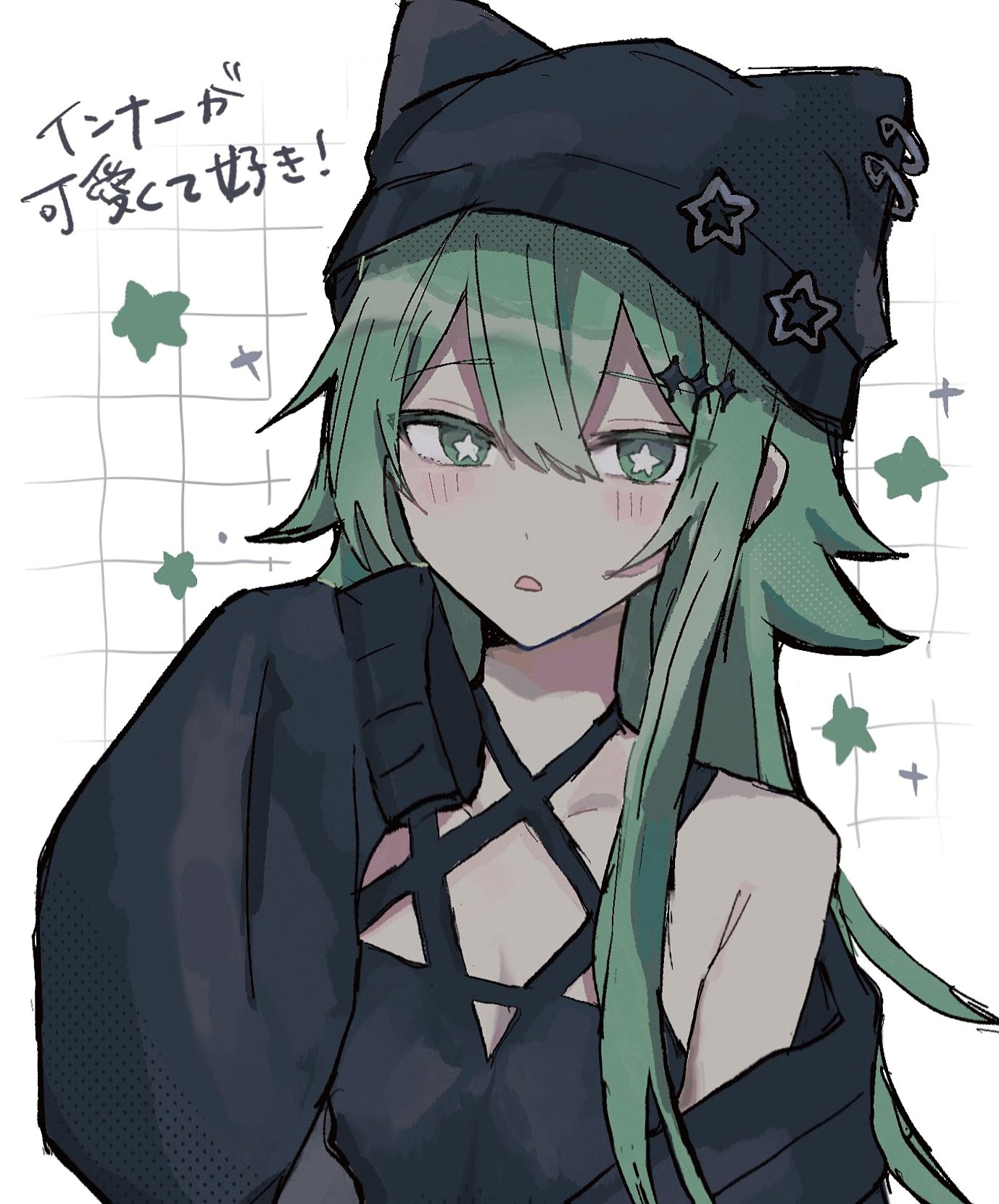 1girlanimal hatarm upblack hatblack jacketblack leotardborrowed characterbreastscat hatcleavagegreen eyesgreen hairhair flapshathat ornamentjacketleotardlong hairlooking at viewernanase (namin)open clothesopen jacketpaperclipparted lipspentagramsidelockssolosparkle hair ornamentstar (symbol)star hat ornamentstar-shaped pupilssymbol-shaped pupilsupper body