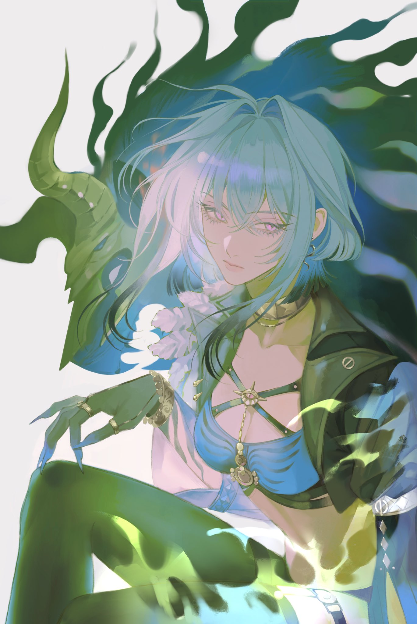 1girlblack jacketblue brabrabreastsclosed mouthcolored inner haircropped jacketearringsgrey backgroundgrey hairhair between eyesjacketjewelrymedium breastsmedium hairmulticolored hairpurple eyessimple backgroundsolostomachtacet discord (wuthering waves)underwear